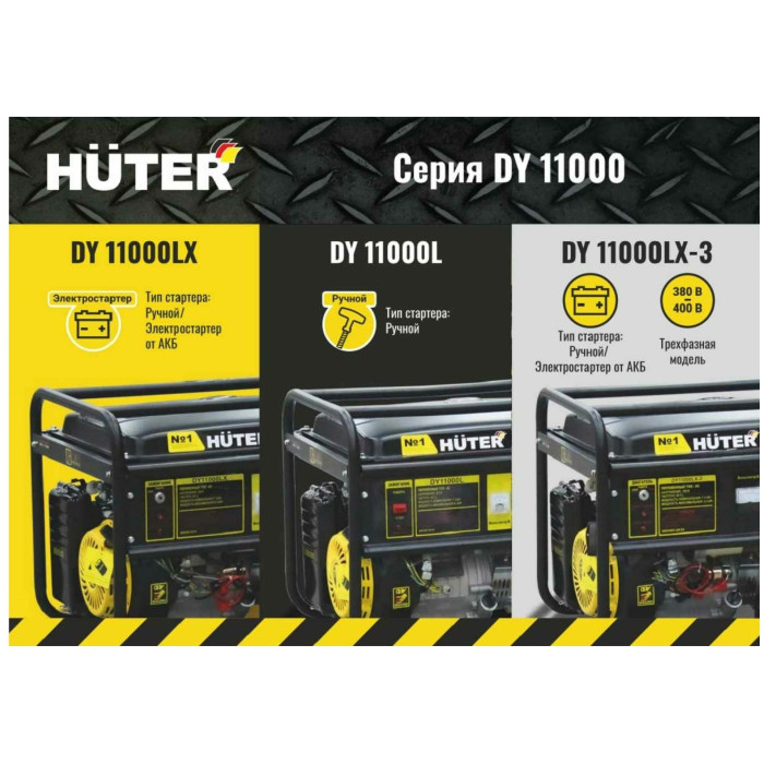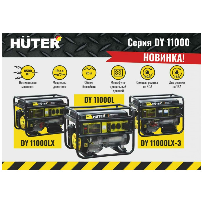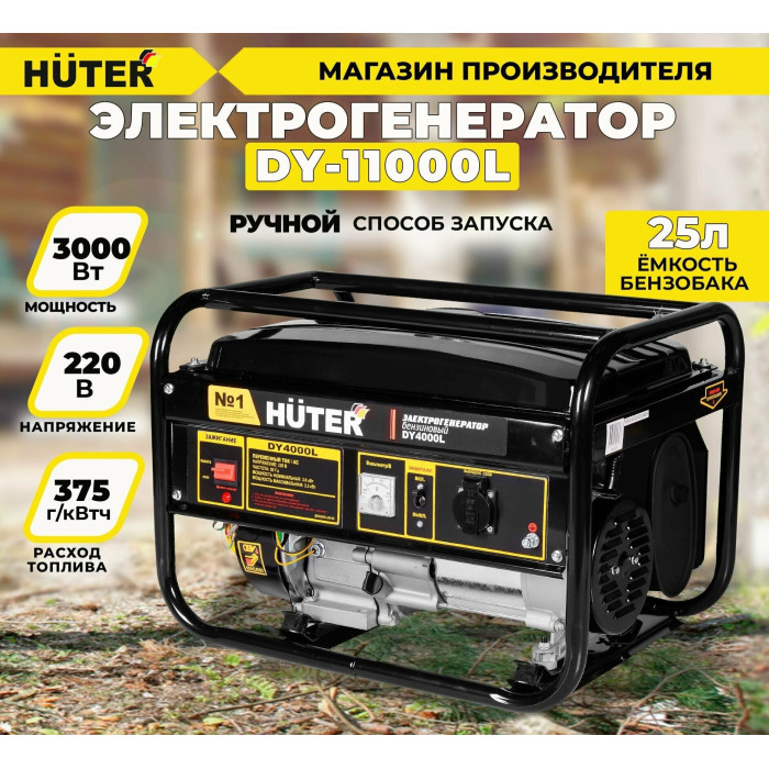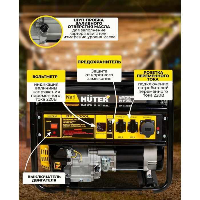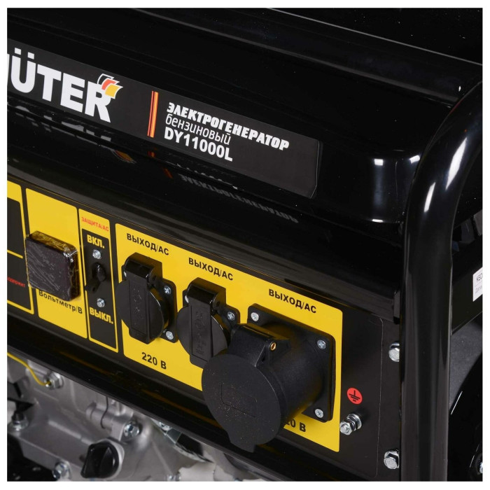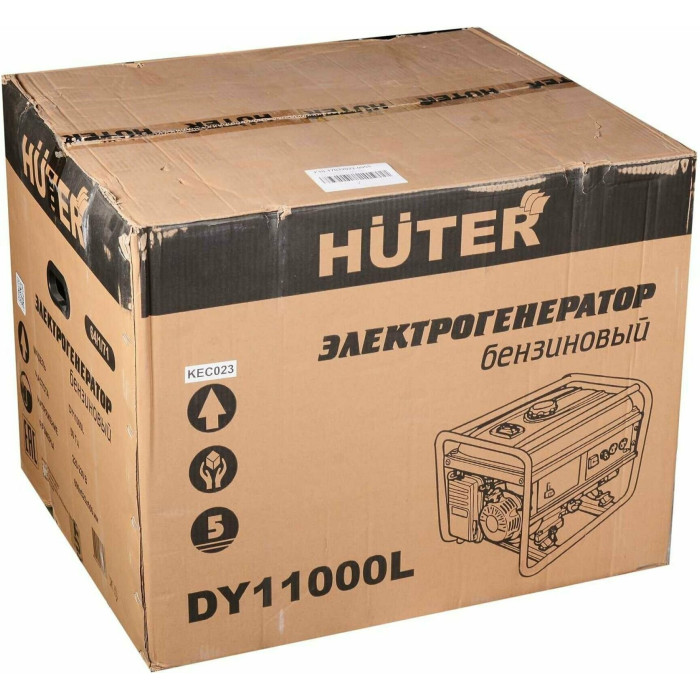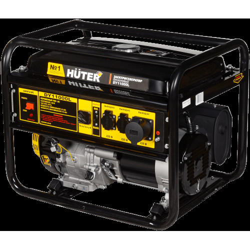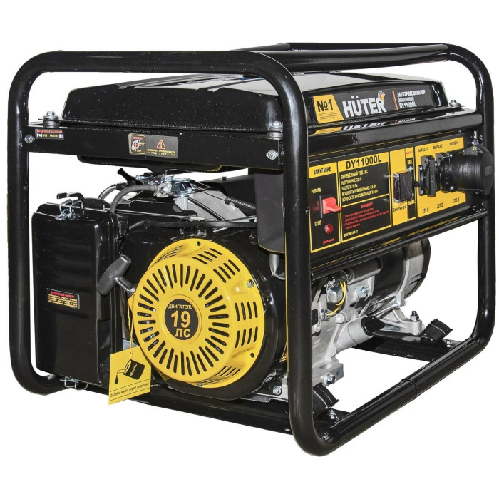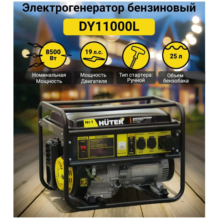 Бензиновый генератор Huter DY11000L – портативная компактная электростанция, обеспечивающая электроснабжение бытовой техники и профессионального оборудования, питающегося от стандартной однофазной сети 220 Вольт. Это самый выгодный бензиновый электрогенератор, с оптимальными техническими характеристиками и низким расходом топлива. Модель DY11000L может использоваться в качестве резервного источника питания для частных домов и квартир, а также как постоянная станция, обеспечивающая работу электроприборов в полевых условиях. Генерирующая установка имеет синхронный тип устройства и щёточный механизм. Комплектация: Бензиновый электрогенератор. Силовая вилка 32 А Свечной ключ. Вороток либо отвёртка (в зависимости от модели) Комплект резиновых опор с гайками Паспорт (руководство по эксплуатации) Бензиновая электростанция Huter DY11000L оборудована мощным одноцилиндровым четырёхтактным двигателем внутреннего сгорания, мощностью 19 л. с. Запуск производится ручным стартером. Для удобства транспортировки, отдельно можно приобрести колёса и ручки. Электрогенератор DY11000L имеет рабочую мощность 8,5 кВт, а также все виды защиты – от перегрузки, короткого замыкания и низкого масляного уровня.