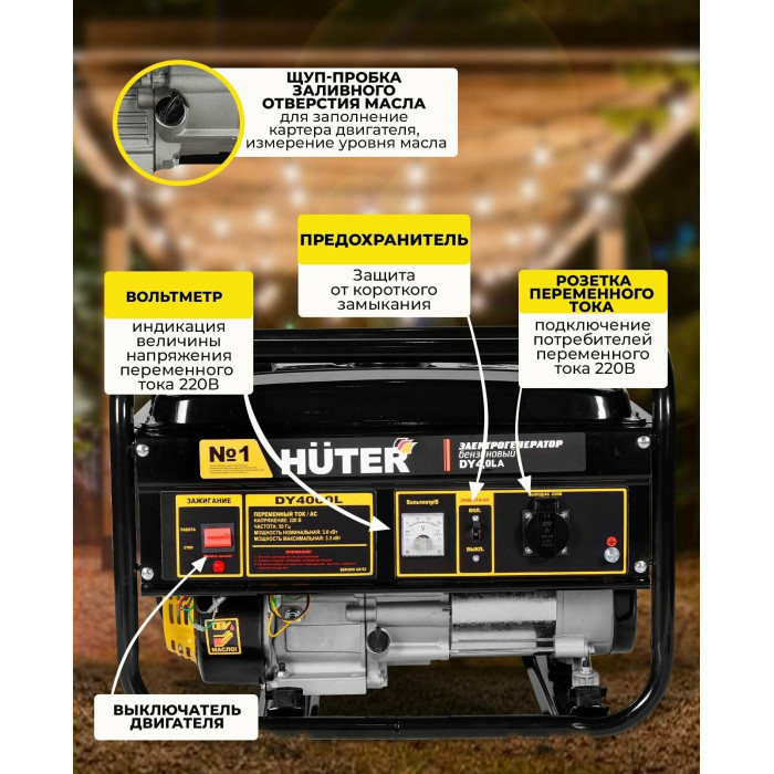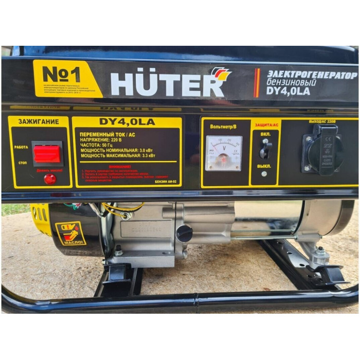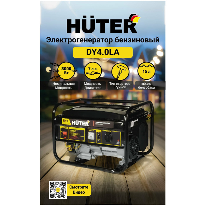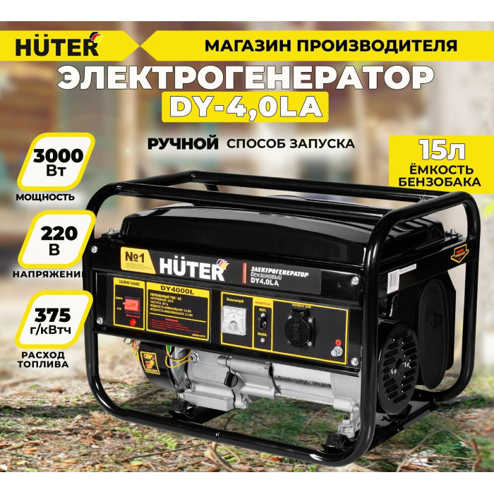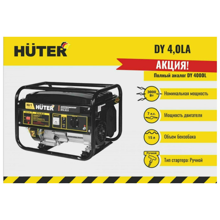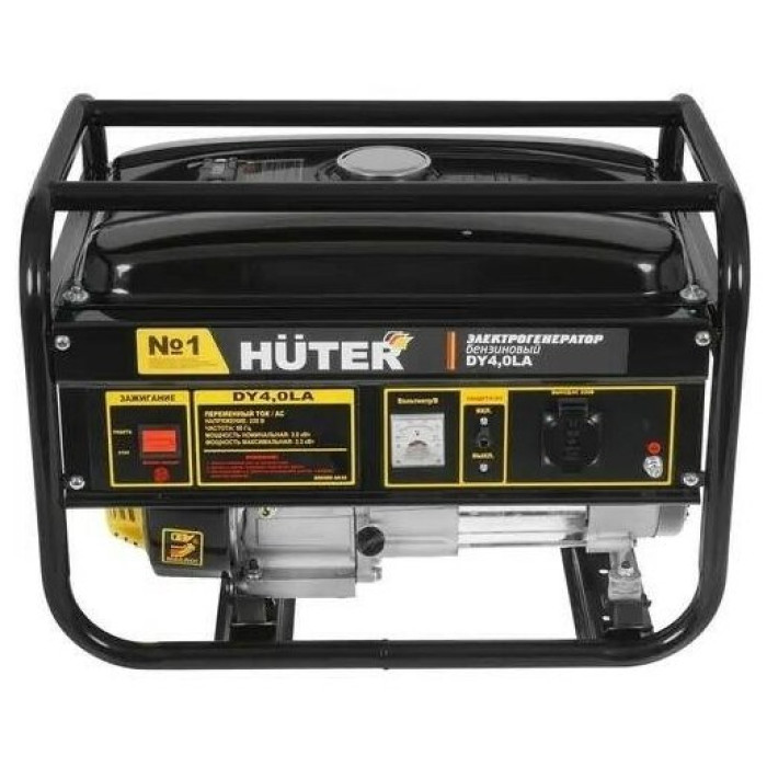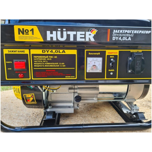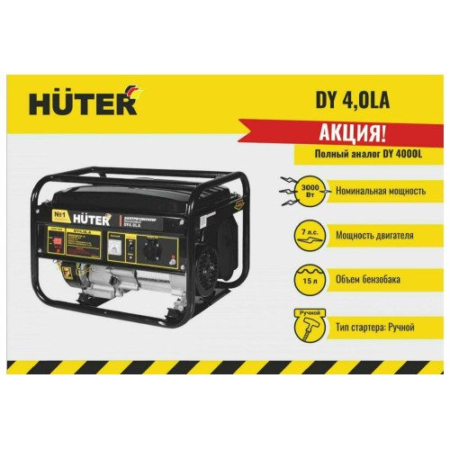 Электрогенератор HUTER DY4,0LА предназначен для организации автономного или резервного снабжения электроэнергией там, где отсутствует система центрального электроснабжения или случаются частые отключения электроэнергии. Он оснащён карбюраторным одноцилиндровым бензиновым двигателем мощностью в 7 л. с. Данный бензогенератор работает на неэтилированном бензине марки АИ 92. Вес электрогенератора составляет 43 кг.