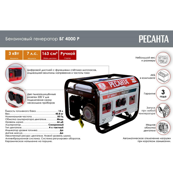 генераторы имеют увеличенный ресурс двигателя; медная обмотка альтернатора; оснащен многофункциональным цифровым дисплеем с функциями индикации величины напряжения, частоты тока и счетчика моточасов; комплектация: бензиновый электрогенератор, свечной ключ с воротком, комплект резиновых опор с гайками, паспорт (руководство по эксплуатации)