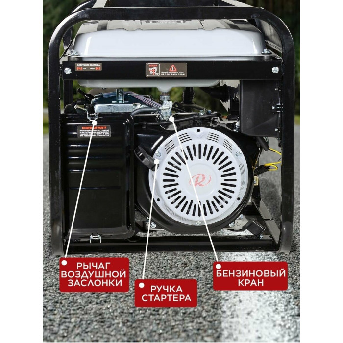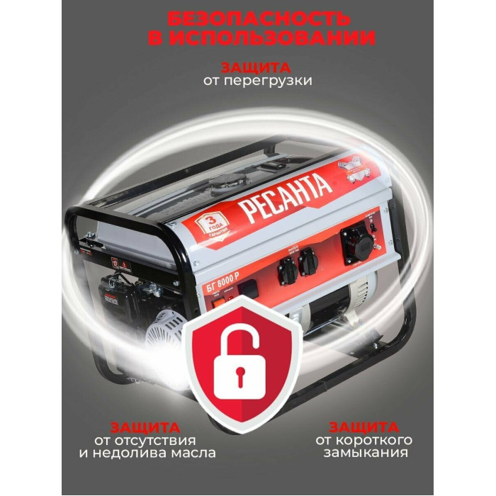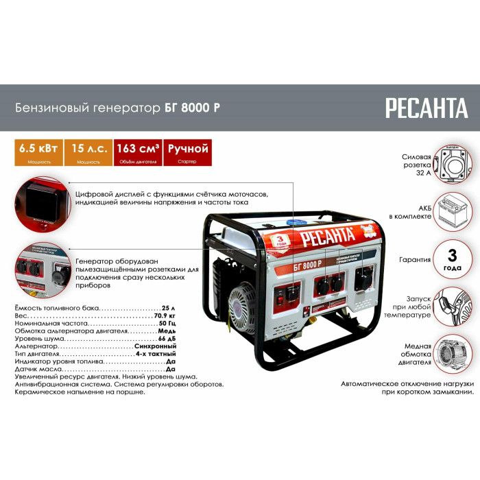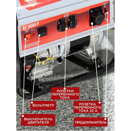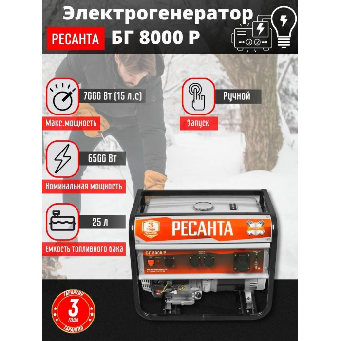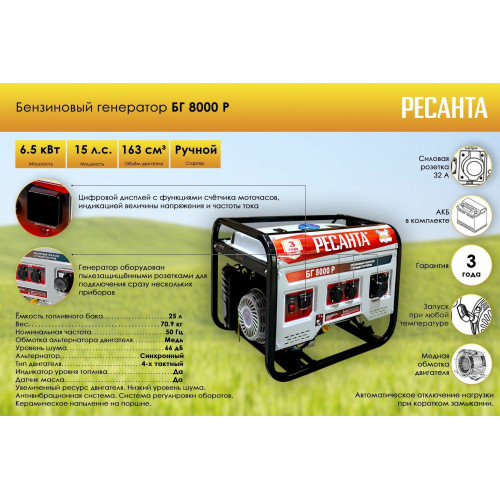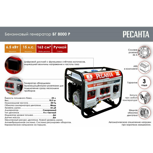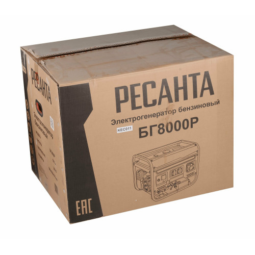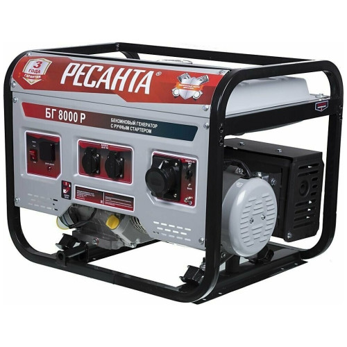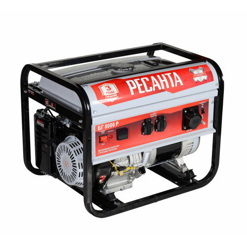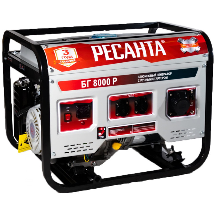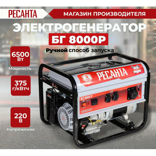 Генератор Ресанта БГ 8000 Р однофазный (220 вольт), максимальная мощность 6.5кВт, бензиновый 4-х тактный двигатель (64/1/47)