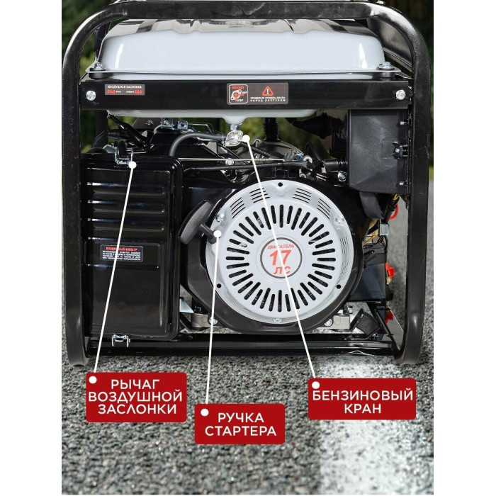 комплектация: бенз. электрогенератор, вилки (по типу и кол-ву розеток на панели), свечной ключ, вороток, комплект резиновых опор с гайками, аккум. батарея, ключ электростартера, провода и детали лотка АКБ, паспорт, коробка