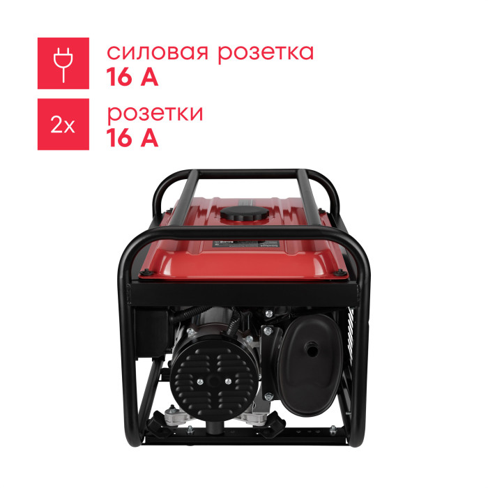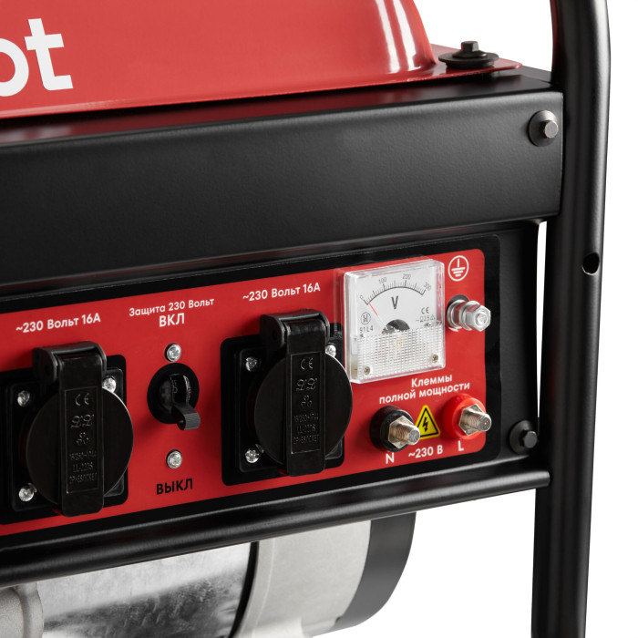 вольтметр, датчик уровня масла, защита от перегрузок, индикатор уровня топлива; в комплекте электрические вилки - 2 шт, свечной ключ, резиновые виброопоры