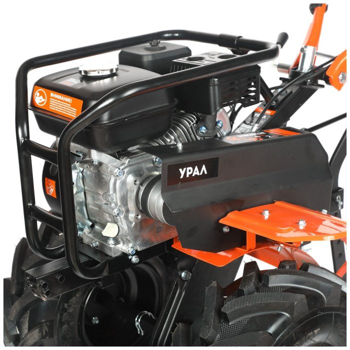 Урал - бензиновый мотоблок с 4-х тактным двигателем повышенного ресурса и цельнолитым чугунным цепным редуктором. Конструкция рамы облегчает транспортировку мотоблока и защищает двигатель, глушитель и бензобак. 4-х ступенчатая коробка передач. Перекидывание ремня между проточками трехручейкового шкива включает пониженную передачу. На сцепку устанавливается навесное оборудование или тележка. В комплекте закаленные фрезы, широкие колеса Extreme с глубоким протектором, сошник. Кнопка включения, рукоятка газа и рычаг привода расположены на руле. Наклон руля регулируется.