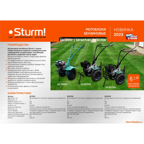 Мотоблок бензиновый Sturm GK937G8 - 3-х скоростная модель (понижающая, основная и повышающая) с валом отбора мощности. Удобный руль с регулировкой вверх-вниз/влево-вправо.
