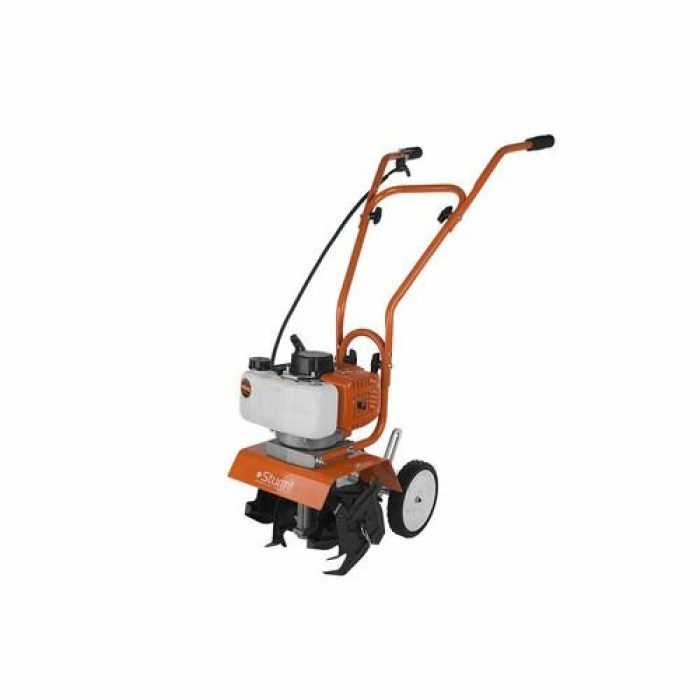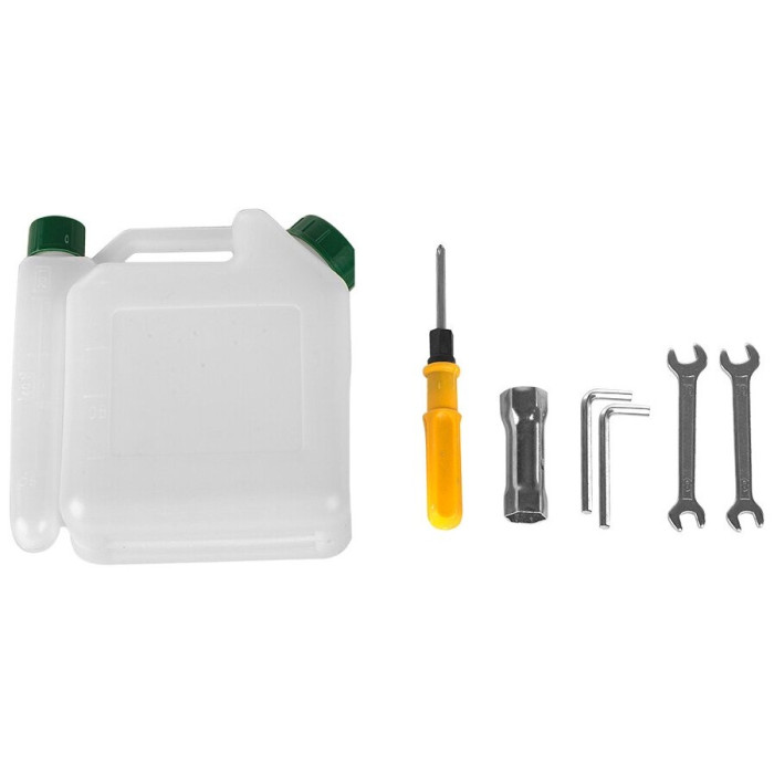 Культиватор; 4 фрезы; гаечный ключ - 2 шт.; торцевой Г-образный ключ - 2 шт.; торцовочный ключ; отвертка; бак для приготовления топливной смеси; транспортировочные колеса.