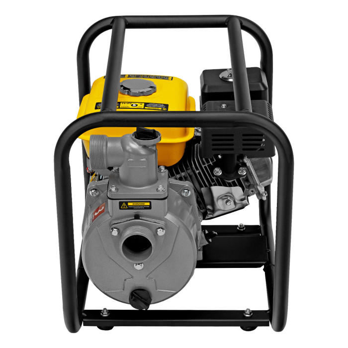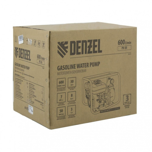 Бензиновая мотопомпа для чистой воды Denzel PX-50 99201 производительностью 600 л/мин, с двигателем мощностью 7 л. с. и штуцерами диаметром 2 дюйма, обеспечивает напор до 30 м и глубину всасывания до 8 м. Применяется для откачивания воды из бассейнов, водоемов, затопленных подвалов и складских помещений. Подходит для подачи воды на участок или в систему полива, может использоваться для проведения коммунальных, промышленных и строительных работ. Объем бака составляет 3 л, а расход топлива — 1,8 л/ч, поэтому мотопомпа способна проработать более чем 1,5 ч на полной мощности без дозаправки. ПреимуществаНадежный двигатель Denzel Long Life series — чугунная гильза цилиндра, свеча зажигания Bosch, стальные коленчатый и распределительный вал обеспечивают длительную и стабильную работу. Встроенная система защиты — при низком уровне масла двигатель автоматически отключается, что предотвращает его выход из строя. Регулировка оборотов двигателя — можно устанавливать необходимую интенсивность подачи воды. Легкий запуск — благодаря ручному стартеру двигатель легко заводится даже в холодную погоду. Прочная конструкция — усиленная рама с широким основанием защищает мотопомпу от повреждений и обеспечивает устойчивость даже на неровной поверхности. Готовность к работе — в комплект входит набор хомутов и инструментов для подключения шланга. Мобильность — благодаря небольшому весу 22 кг и отсутствию необходимости подключения к сети мотопомпу удобно перемещать по рабочей площадке. Расширенная 3-летняя гарантия — высокое качество оборудования подтверждено производителем.
