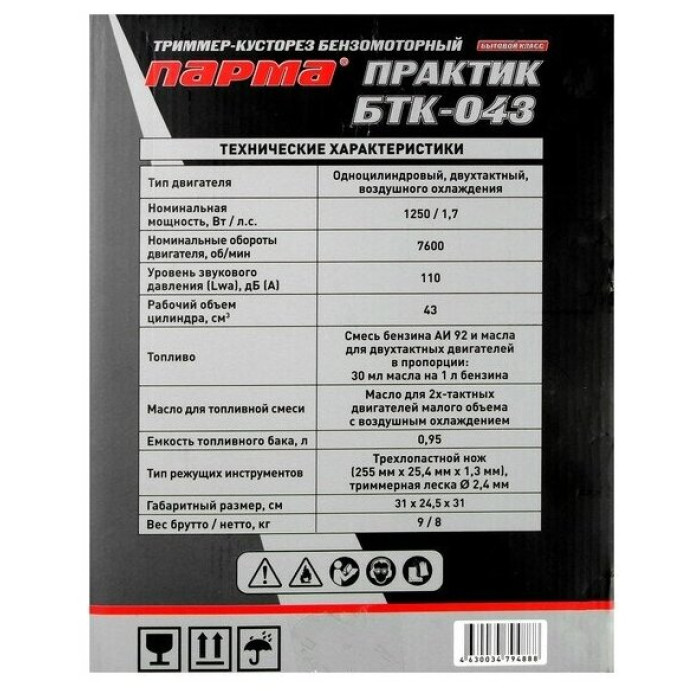 тип: триммер, тип двигателя: бензиновый, режущий элемент триммера: леска и нож, тип триммера: переносной, конструкция штанги: прямая, количество тактов двигателя: 2х тактный, мощность: 1.70 л.с., расположение двигателя: верхнее, толщина лески: 2.40 мм, ширина скашивания: 40 см, форма рукоятки: Т-образная (велосипедная), вес: 8 кг