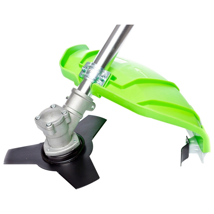 Триммер; Усиленная катушка с леской с металлической кнопкой; Трехлопастной диск из закаленной стали толщиной 3 мм; Наплечный ремень с мягкими накладками; Инструкция.