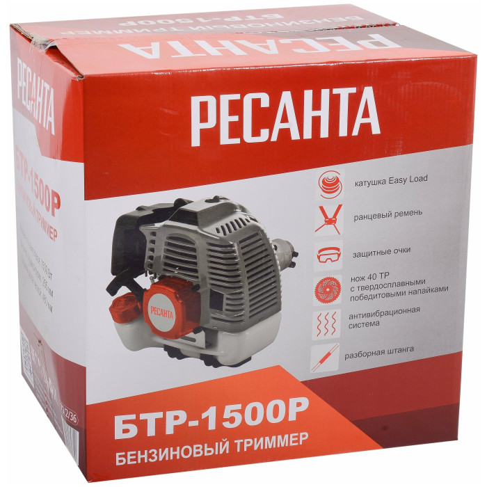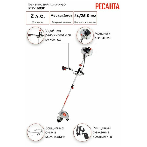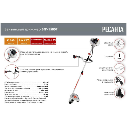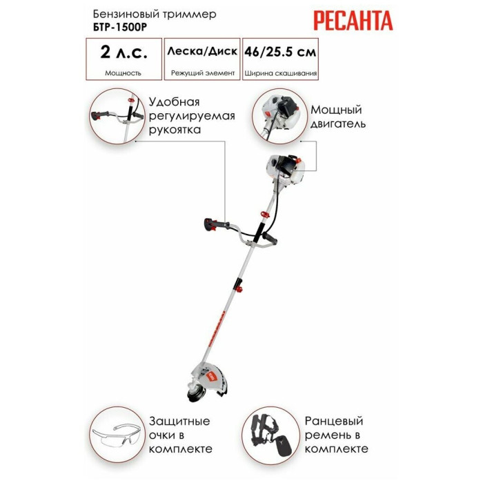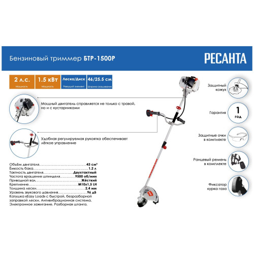 тип: триммер, тип двигателя: бензиновый, режущий элемент триммера: леска и нож, тип триммера: переносной, конструкция штанги: прямая, количество тактов двигателя: 2х тактный, мощность: 2 л.с., расположение двигателя: верхнее, плечевой ремень, толщина лески: 2.40 мм, ширина скашивания: 46 см, рекомендуемая площадь скашивания: 100 м², дополнительные функции: антивибрационная система, возможность установки культиватора, форма рукоятки: U-образная, вес: 10 кг