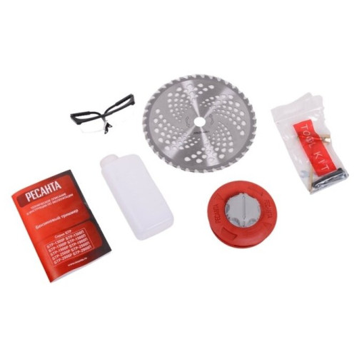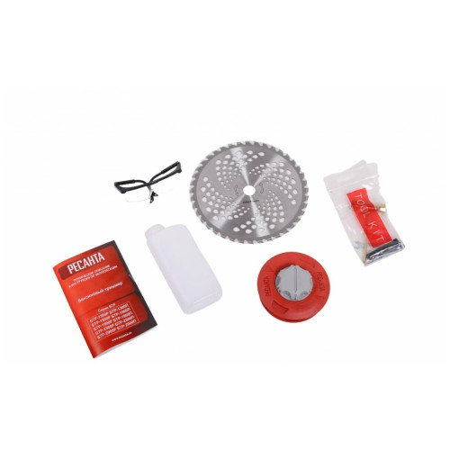 триммер бензиновый; защитный кожух; режущий диск; катушка с леской; рукоятки управления (левая и правая); комплект ключей; паспорт продукции