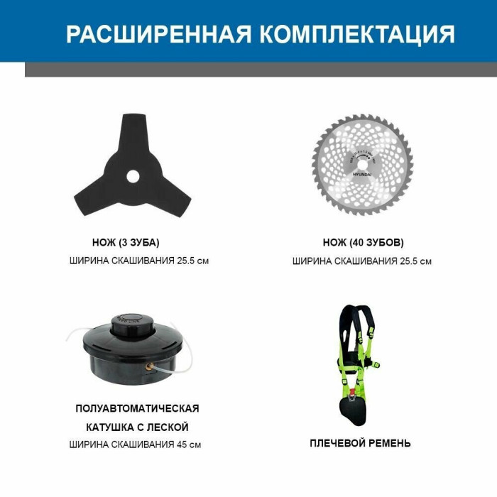 мотокоса - 1 шт., плечевой ремень - 1 шт., профессиональная катушка для лески - 1 шт., набор ключей для ввода бензокосы в эксплуатацию - 1 шт., нож (40 зубцов) - 1 шт., нож (3 зуба) - 1 шт., руководство пользователя - 1 шт., упаковка - 1 шт