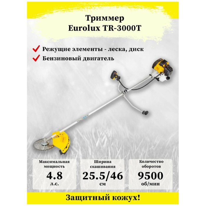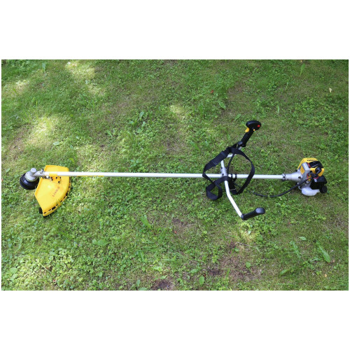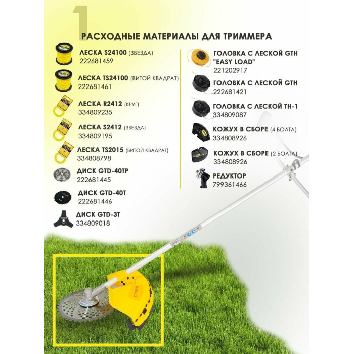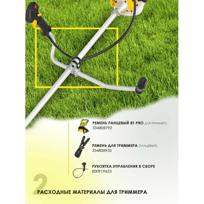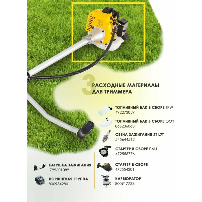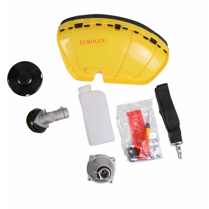 Двигатель в сборе. Штанга. Рукоять. Ремень Катушка с леской. Нож. Защитный кожух. Набор ключей. Паспорт.