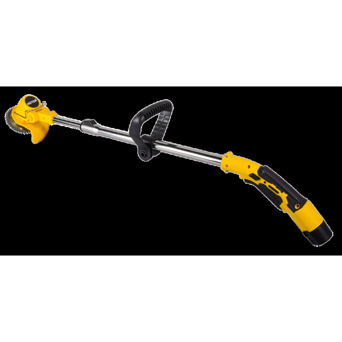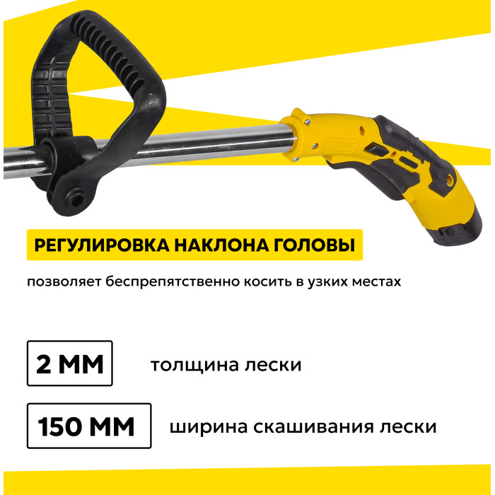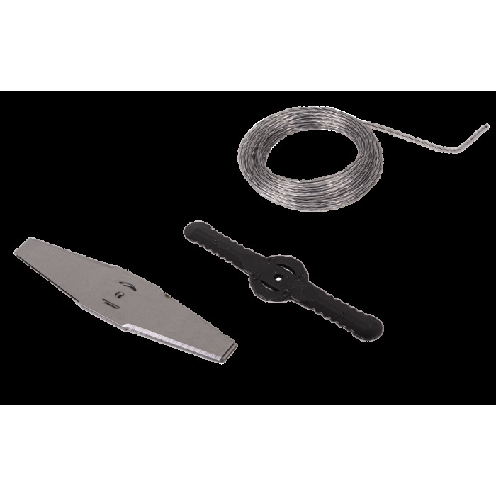 Триммер в сборе – 1 шт; Аккумулятор – 2 шт; Защитный кожух – 1 шт; Крепежный комплект – 1 шт; Инструмент для крепежа – 1 шт; Леска нейлоновая – 5 м; Диск металлический для кошения – 1 шт; Нож нейлоновый для кошения – 5 шт; Нож металлический для кошения – 2 шт; Рукоятка – 2 шт; Руководство по эксплуатации.