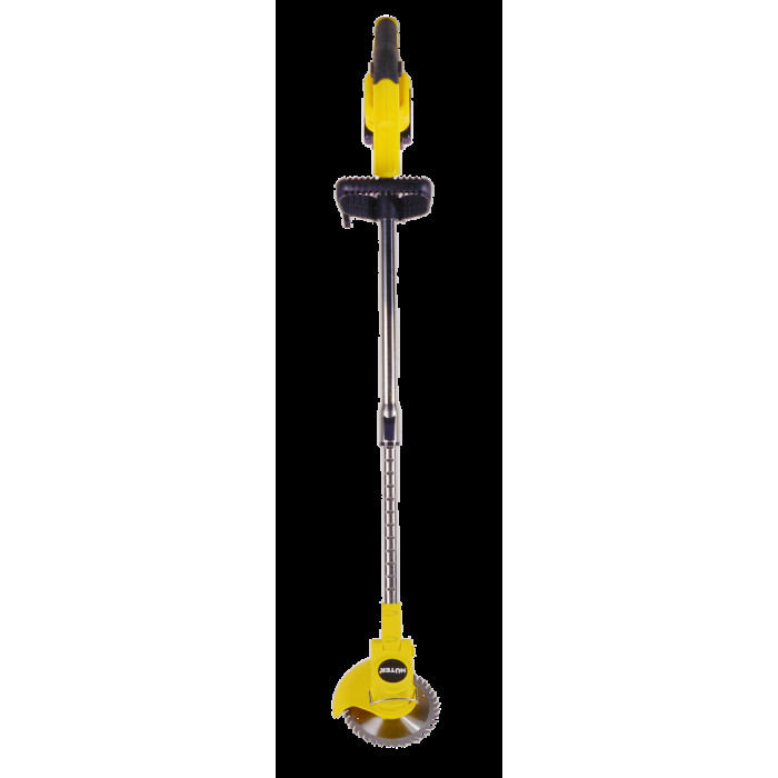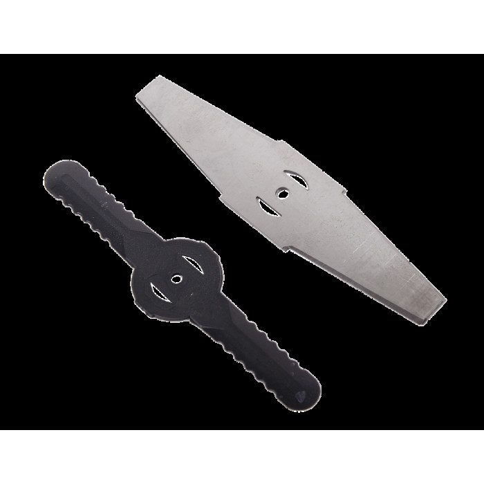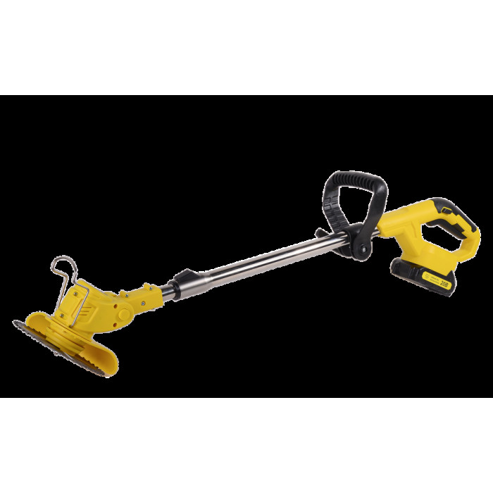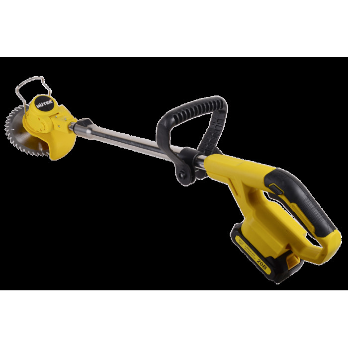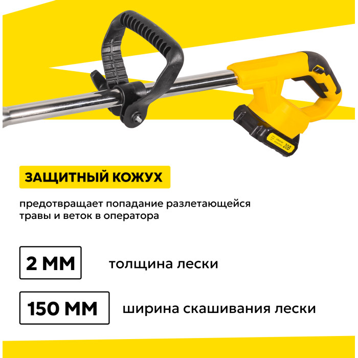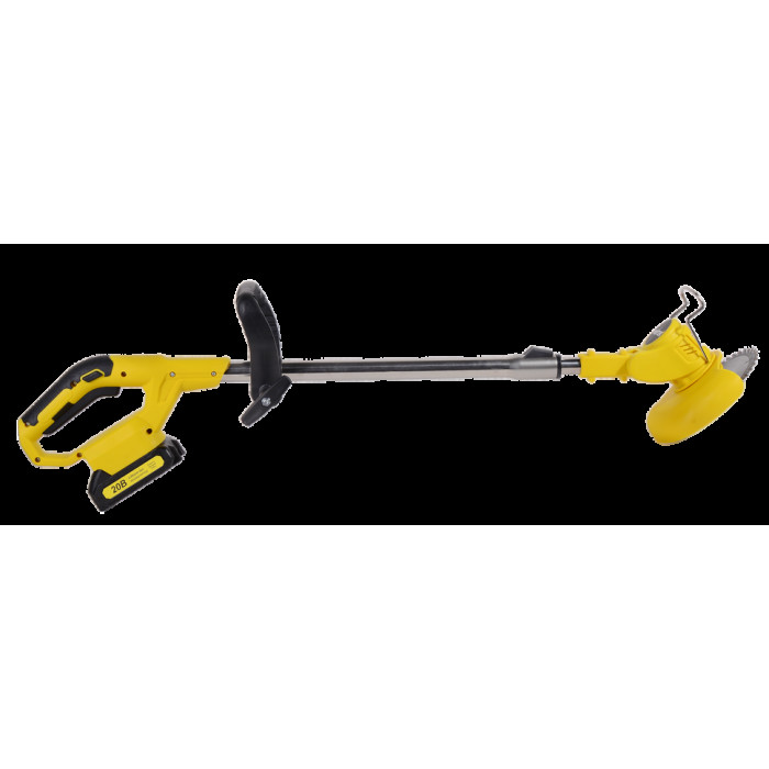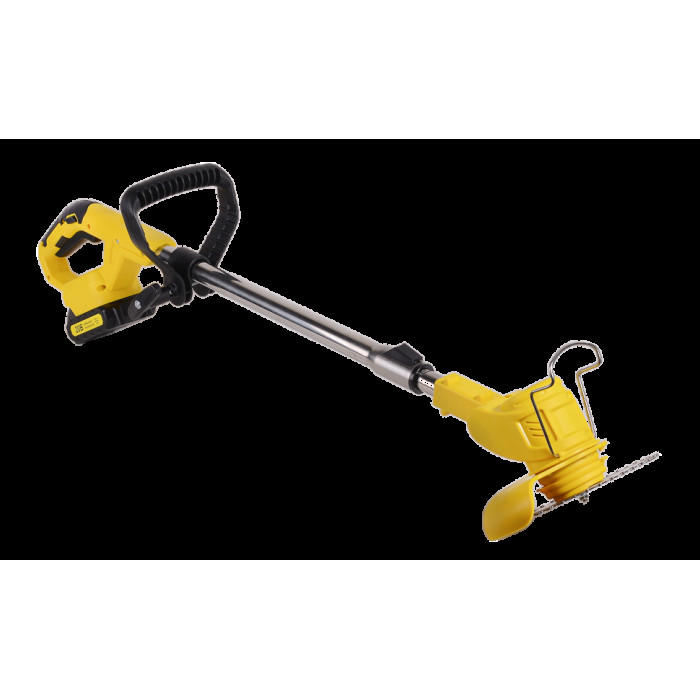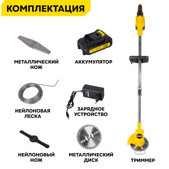 Триммер в сборе – 1 шт; Аккумулятор – 1 шт; Защитный кожух – 1 шт; Крепежный комплект – 1 шт; Инструмент для крепежа – 1 шт; Леска нейлоновая – 5 м; Диск металлический для кошения – 1 шт; Нож нейлоновый для кошения – 5 шт; Нож металлический для кошения – 2 шт; Рукоятка – 2 шт; Руководство по эксплуатации.
