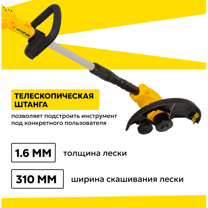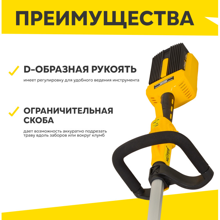 Триммер в сборе – 1 шт; Аккумулятор – 1 шт; Зарядное устройство – 1 шт; Защитный кожух – 1 шт; Крепежный комплект – 1 шт; Рукоятка – 1 шт; Руководство по эксплуатации.