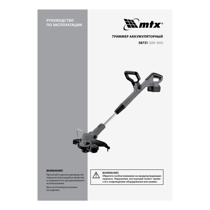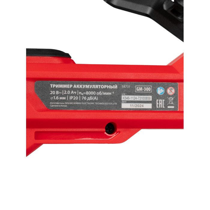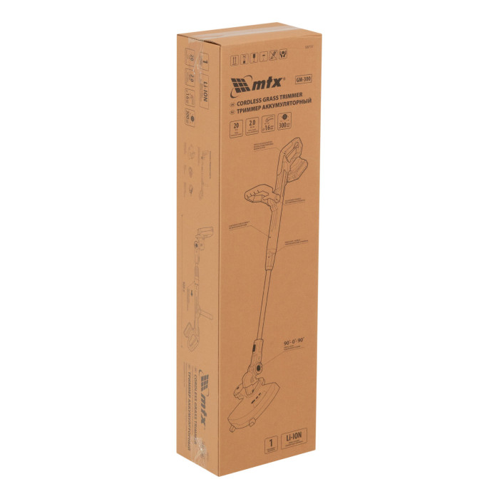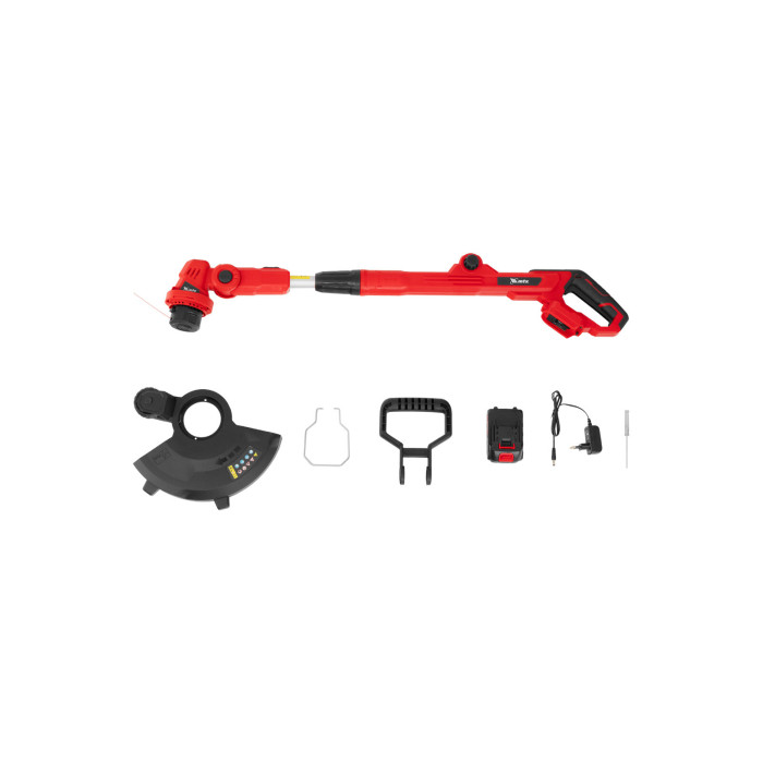 Триммер 1 шт Комплект крепежа 1 шт Кожух защитный 1 шт Аккумуляторная батарея 1 шт Зарядное устройство 1 шт Руководство по эксплуатации с гарантийным талоном 1 шт