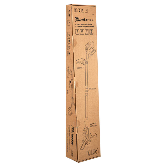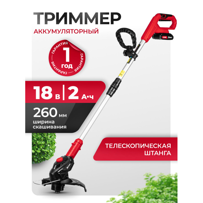 Триммер аккумуляторный - 1 шт, Защитный кожух - 1 шт, Аккумуляторная батарея 18 В, 2 Ач - 1 шт, Зарядное устройство - 1 шт, Инструкция по эксплуатации с гарантийным талоном - 1 шт.