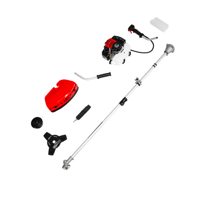 Двигатель с правой рукояткой 1 шт Левая рукоятка 1 шт Штанга 1 шт Защитный кожух с ножом 1 шт Кронштейн защитного кожуха 1 шт Катушка с леской 1 шт Нож трехлопастной 1 шт Дозатор для приготовления смеси 1 шт Ремень плечевой 1 шт Корпус сцепления с крепежом 1 шт Редуктор с винтами 1 шт Узел крепления рукояток с крепежом 1 шт Узел подвеса ремня 1 шт Свечной ключ 1 шт Имбусовый ключ Н5 1 шт Имбусовый ключ Н6 1 шт Болт M6×20 4 шт Болт M5×15 2 шт Гайка M5 2 шт Хомут 2 шт Соединительная муфта 1 шт Коннектор штанги 1 шт Руководство по эксплуатации с гарантийным талоном 1 шт