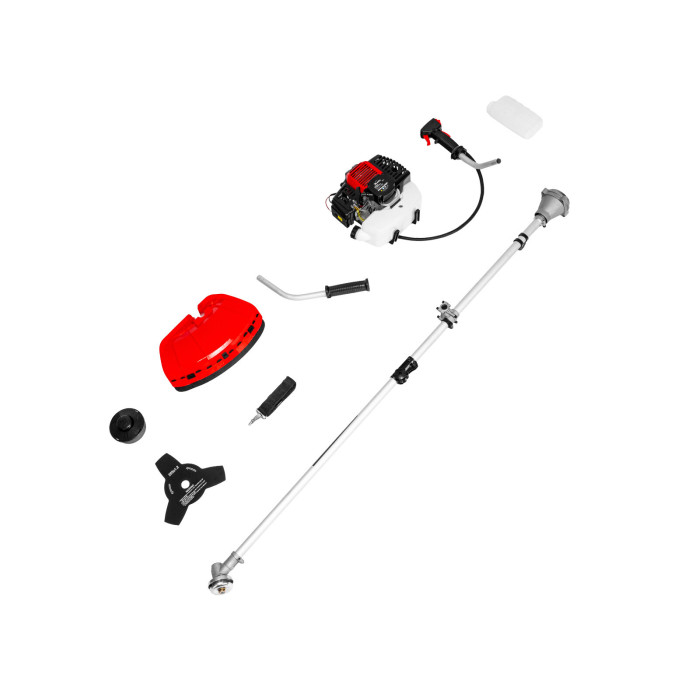 Двигатель с правой рукояткой 1 шт Левая рукоятка 1 шт Штанга 1 шт Защитный кожух с ножом 1 шт Кронштейн защитного кожуха 1 шт Катушка с леской 1 шт Нож трехлопастной 1 шт Дозатор для приготовления смеси 1 шт Ремень плечевой 1 шт Корпус сцепления с крепежом 1 шт Редуктор с винтами 1 шт Узел крепления рукояток с крепежом 1 шт Узел подвеса ремня 1 шт Свечной ключ 1 шт Имбусовый ключ Н5 1 шт Имбусовый ключ Н6 1 шт Болт M6×20 4 шт Болт M5×15 2 шт Гайка M5 2 шт Хомут 2 шт Соединительная муфта 1 шт Коннектор штанги 1 шт Руководство по эксплуатации с гарантийным талоном 1 шт
