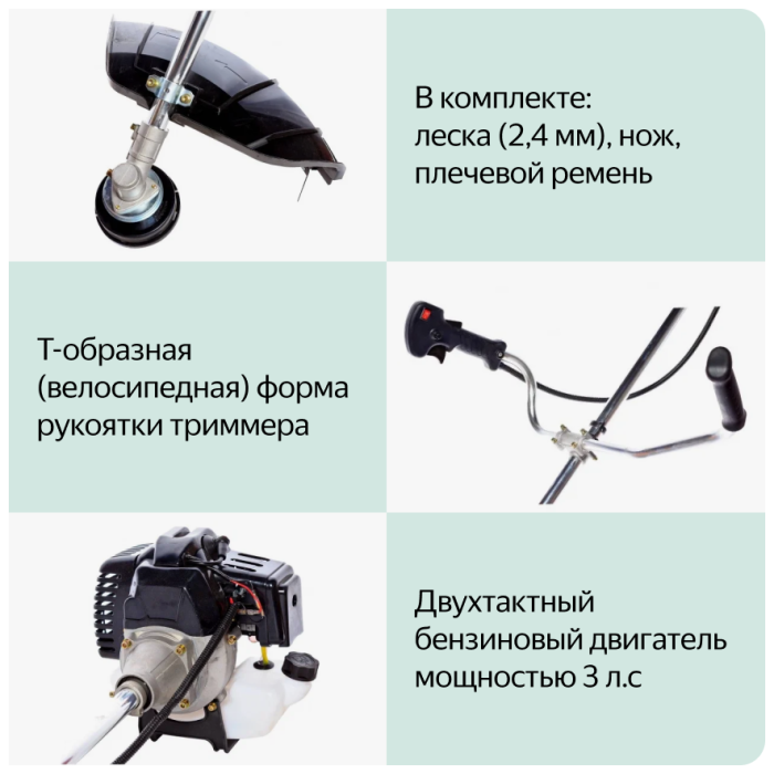 Триммер - 1 шт, Ручка - 1 шт, Штанга - 1 шт, Катушка с леской - 1 шт, Трехлопастной нож - 1 шт, Защитный щиток - 1 шт, Наплечный ремень - 1 шт, Инструкция, Упаковка