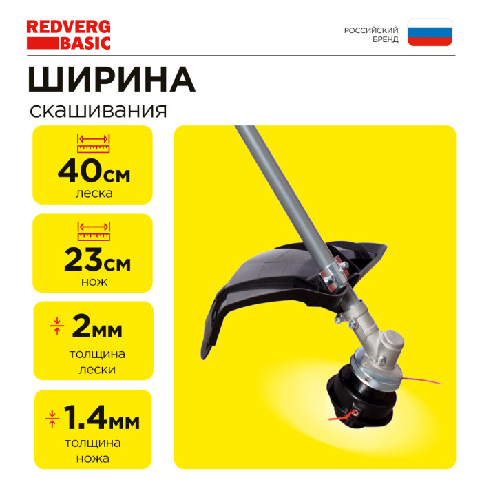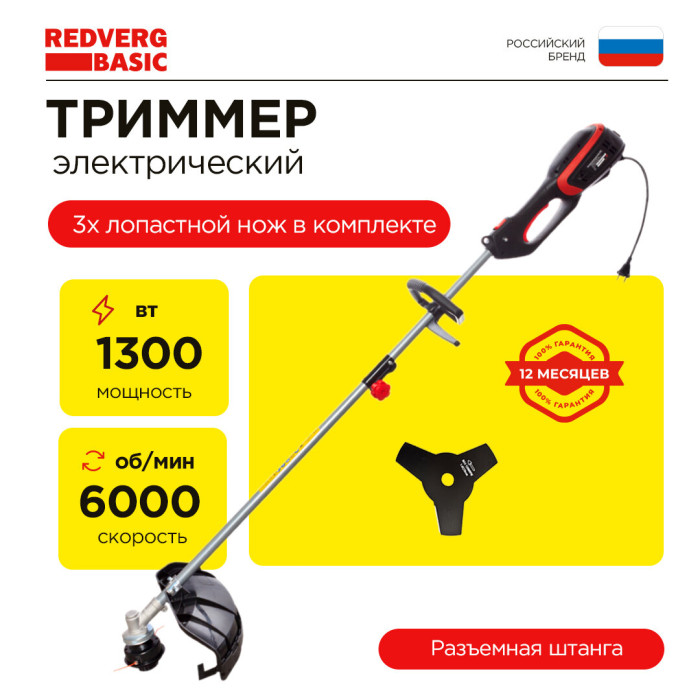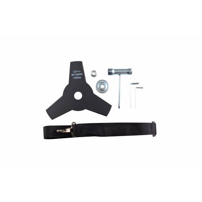 Электрический триммер; Защитный щиток; Пластиковый ключ; Шпулька (катушка) с леской; Трехлопастной нож; Рукоятка дополнительная; Накидной ключ; Шестигранный ключ - 2шт; Гайка - 2шт; Пружинная шайба «гровер» - 2шт; Винт - 2шт; Наплечный ремень (одинарный); Инструкция
