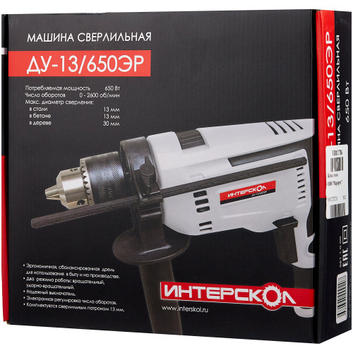 Производитель: ИНТЕРСКОЛ; Реверс: есть; Режим: Ударные; Тип: электродрели; Мощность, Вт: 650; Питание: сетевые; Тип патрона: ключевой; Максимальный размер сверла: 13; Регулировка оборотов: есть; Особенности комплектации: нет