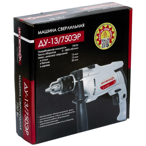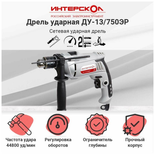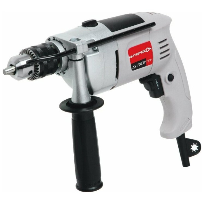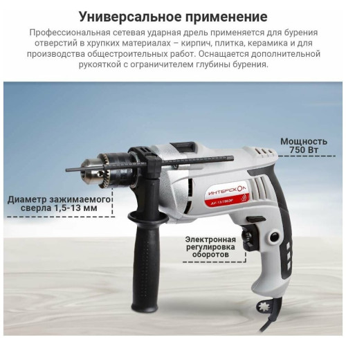 тип: дрель, тип питания: от сети, наличие удара (для дрели): ударная, тип патрона: ключевой, потребляемая мощность: 750 Вт, особенности конструкции: ограничитель глубины сверления, блокировка кнопки включения, дополнительная рукоятка, угловая конструкция, количество скоростей работы: 1, упаковка: коробка, вес: 2.30 кг