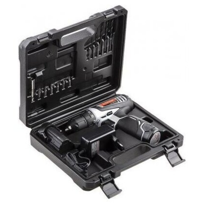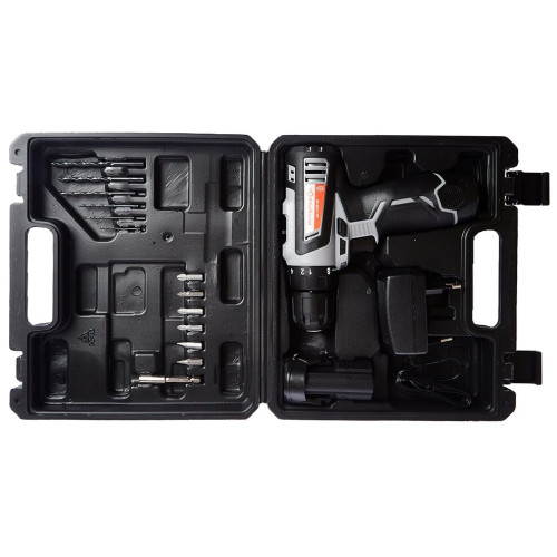 два аккумулятора, зарядное устройство, набор сверл и бит, кейс