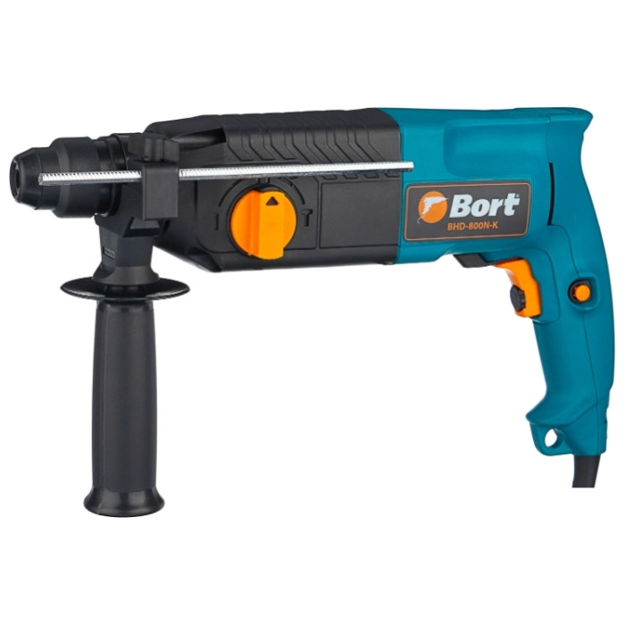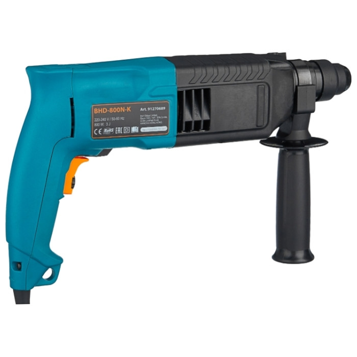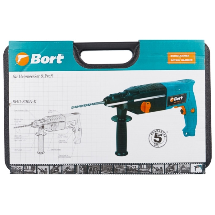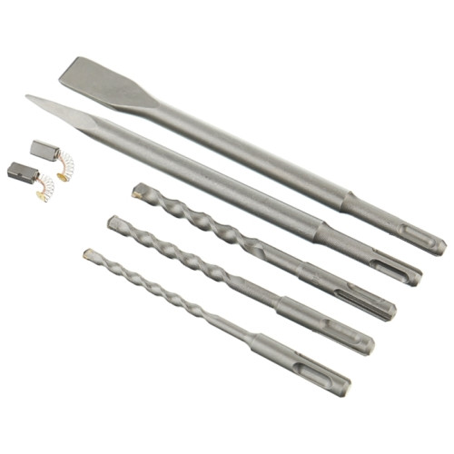 боковая рукоятка, ограничитель глубины сверления, 3 бура, пика, зубило, запасные щетки, кейс