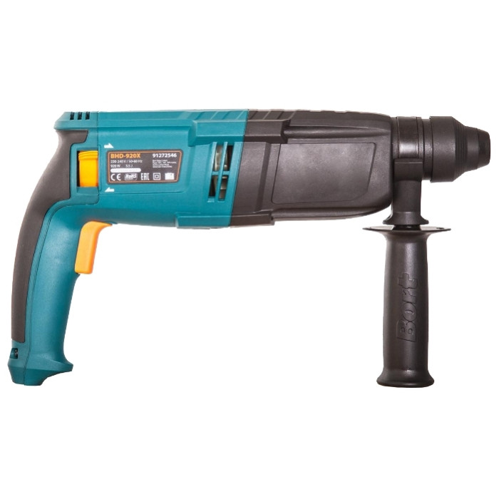 боковая рукоятка, ограничитель глубины сверления, 3 бура, пика, зубило, запасные щетки, кейс