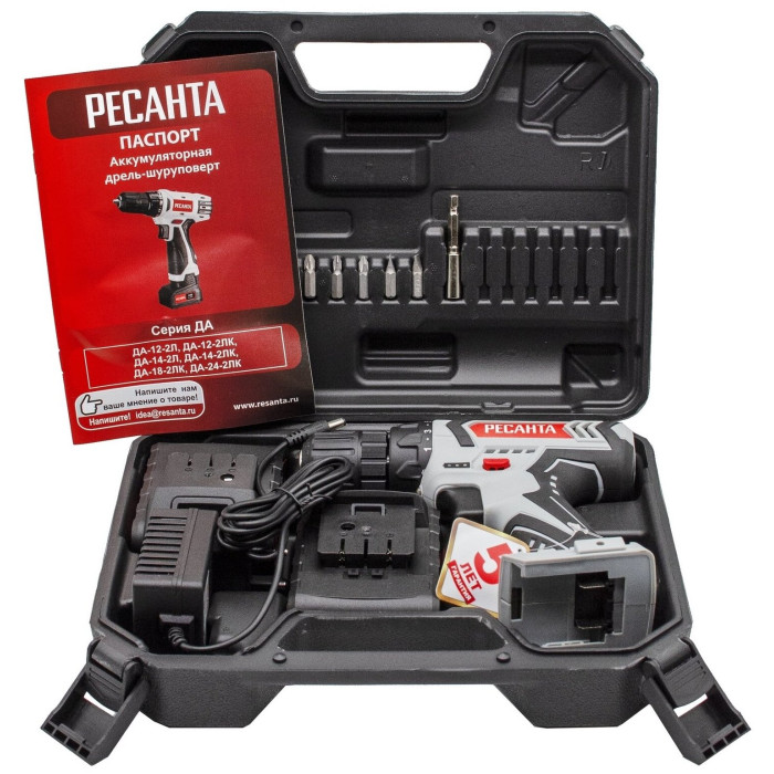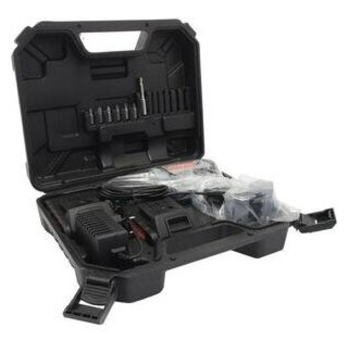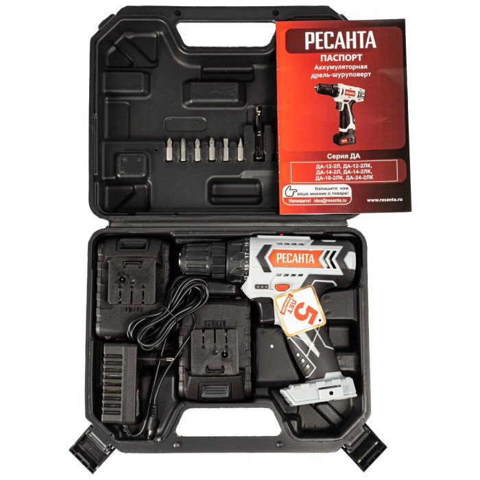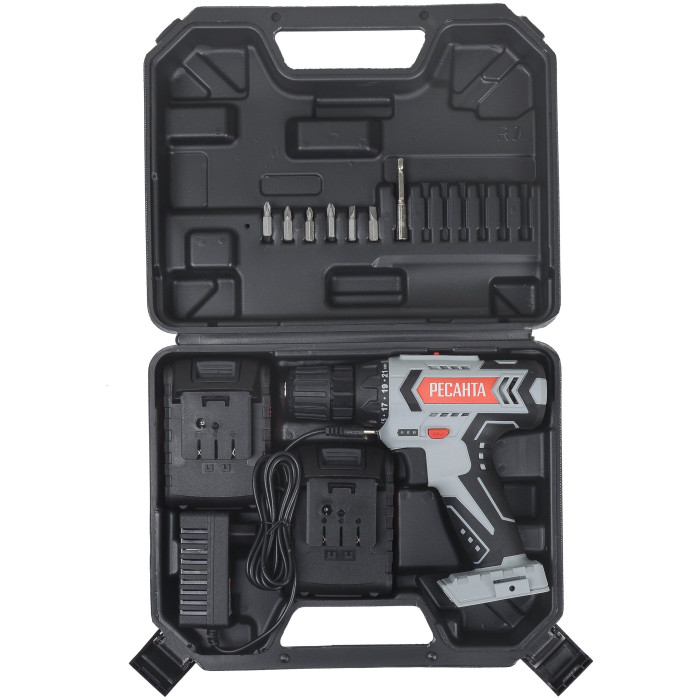 дрель-шуруповерт, два аккумулятора, зарядное устройство, набор бит, удлинитель для бит, кейс, инструкция