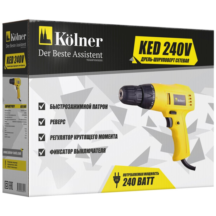 Сетевая дрель-шуруповерт Kolner KED 240 V снабжена быстрозажимным патроном, поэтому замена оснастки не занимает много времени. Кнопка-фиксатор блокирует клавишу включения в режиме работы, что исключает необходимость постоянно держать на ней палец. Предусмотрено 16 ступеней крутящего момента, что позволяет подобрать необходимое значение под конкретный материал.