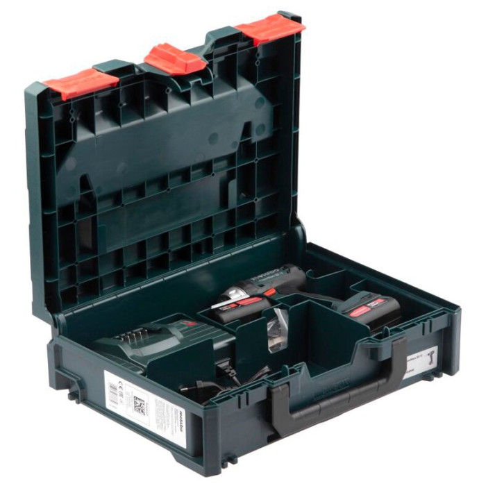 крючок для ношения на ремне и отделение для насадок, быстрозажимной сверлильный патрон, два аккумулятора, зарядное устройство SC 30, кейс metaBOX 118