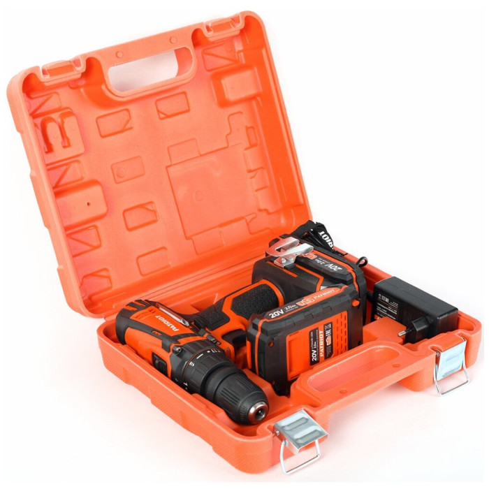 дрель-шуруповерт аккумуляторная, аккумулятор (2 шт.), зарядное устройство, двусторонняя бита, инструкция с гарантийным талоном, кейс