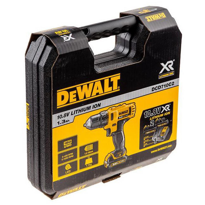 Дрель-шуруповёрт DeWALT DCD710C2 — многофункциональный инструмент с двумя объёмными аккумуляторами. Данная модель оснащена редуктором с регулируемыми скоростями, в том числе с возможностью обратного реверса. Быстрозажимной патрон диаметром 1–10 мм облегчает процесс смены рабочих аксессуаров. Для удобства пользования ручка выполнена из прорезиненного материала, исключающего скольжение. Компактная и лёгкая модель станет практичной помощницей в работе и не займёт много места при хранении, для чего предусмотрен закрытый кейс. Безопасность работы двигателя обеспечивает вентилятор, защищающий от перегрева. Имеется возможность блокировки от случайного включения. Светодиодная подсветка поможет в условиях ограниченного освещения рабочей зоны.