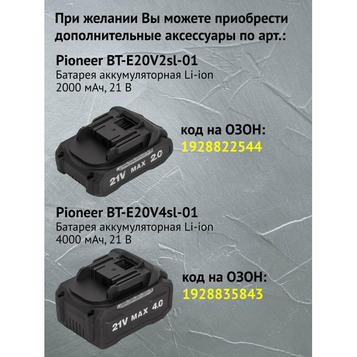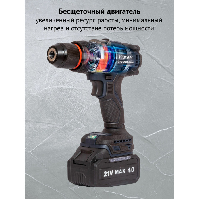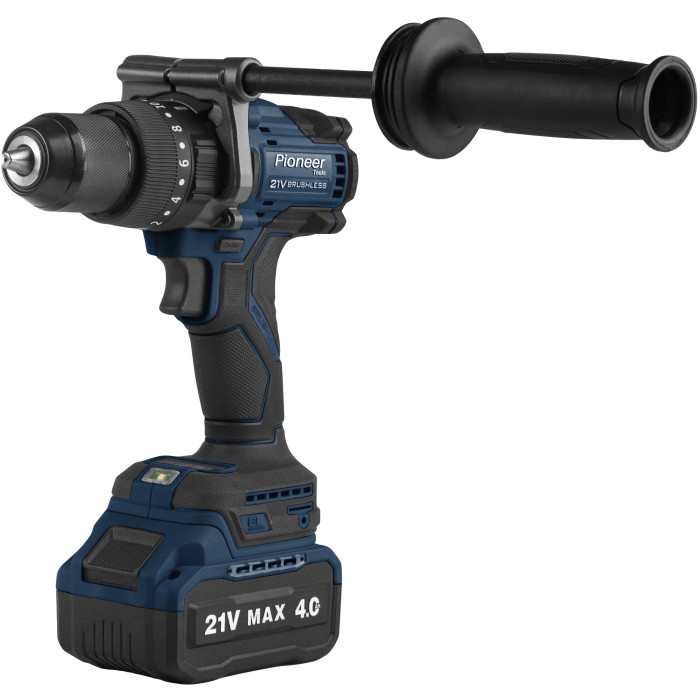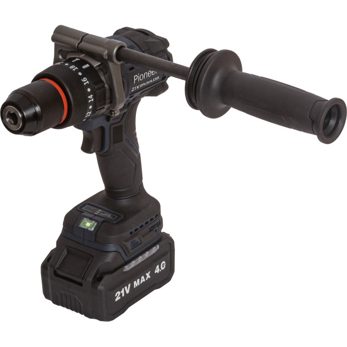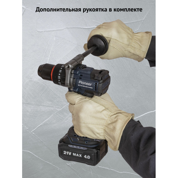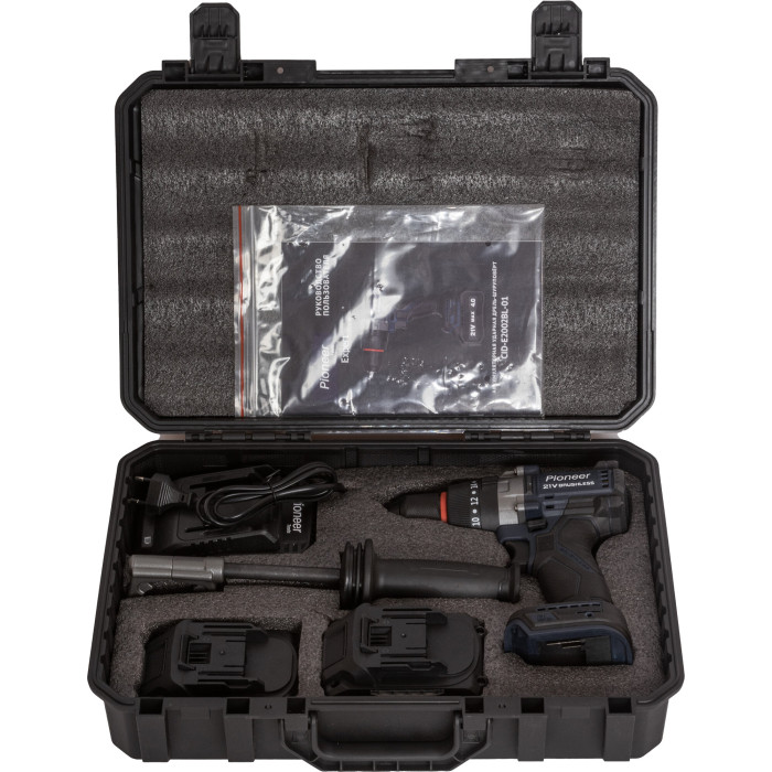 аккумуляторная ударная дрель, аккумулятор 21 В, 2 Ач - 1 шт, аккумулятор 21 В, 4 Ач - 1 шт, быстрое зарядное устройство 21 В, 2 А - 1 шт, дополнительная рукоятка - 1 шт, кейс для хранения, руководство по эксплуатации, гарантийный талон