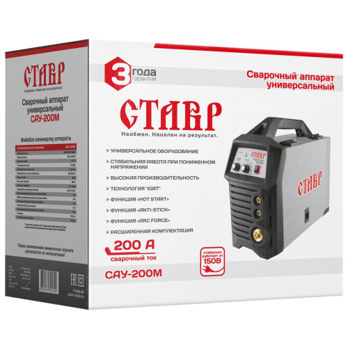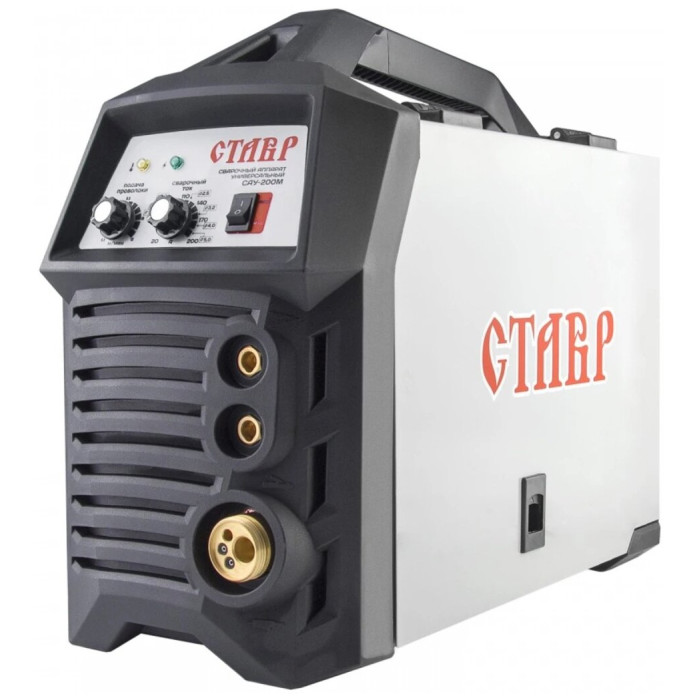 Универсальный инверторный сварочный аппарат Ставр САУ-200 М - высокопроизводительный агрегат, который работает в двух режимах - ММА (ручная дуговая сварка) и MIG-MAG (полуавтоматическая сварка). В работе используются электроды диаметром от 1.6 до 5 мм, либо проволока диаметром от 0.6 до 1 мм. С помощью ручки аппарат легко и удобно перемещается по рабочей площадке. Для защиты зрения пользователя модель оснащается лицевым щитком.