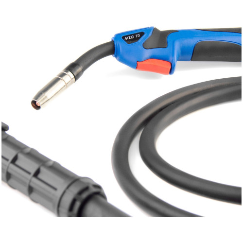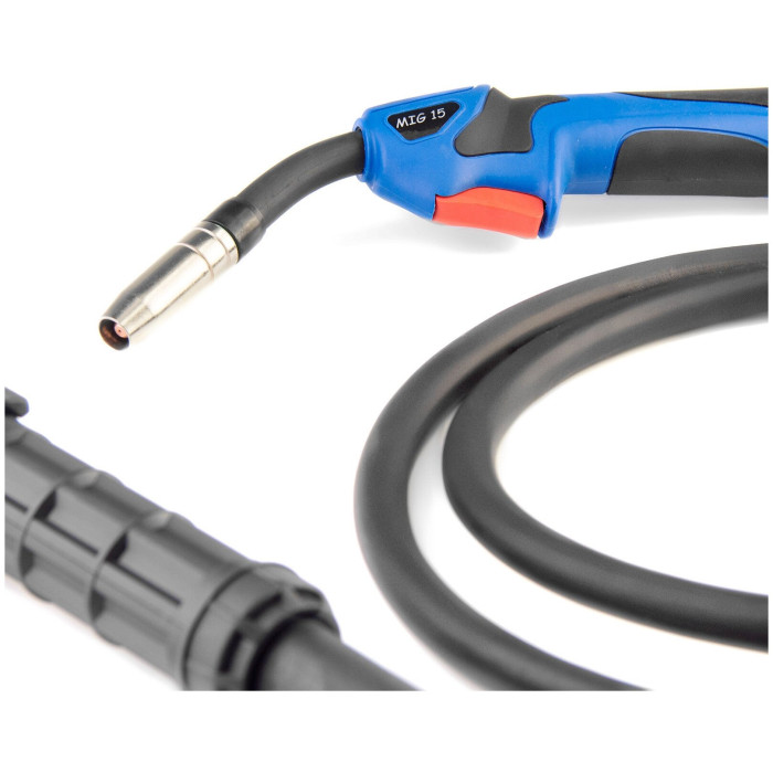 сварочный аппарат, рабочий кабель для MIG сварки со сварочной горелкой, рабочий кабель для MMA сварки с держателем электрода, кабель заземления с клеммой, защитный щиток, металлическая щетка-молоток