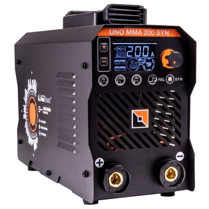 Сварочный аппарат UNO MMA 200 SYN инверторного типа выполнен по последней IGBT технологии, которая позволяет добиваться высокой частоты инвертора с минимальным весом и габаритами, а также почти не издает шума. Аппарат позволяет производить сварку постоянным током любим типом электродов. Обеспечивает качественную сварочную работу, швы хорошего качества, стабильный ток и обладает маленьким разбрызгиванием металла. Инверторы данной серии имеют SMART-дисплей для регулировки SYN-режимов. Совокупность данных технологий позволяет сварщику легко настроить ток по толщине детали, или по заданному диаметру электрода. Также аппараты этой серии имеют 3 функции оптимизации процесса сварки для вашей комфортной работы. Для того, чтобы обеспечить полную отдачу, аппараты серии UNO MMA SYN оснащены панельными розетками 35-50 мм2. В комплекте есть всё для того, чтобы сразу приступить к работе, а сварочные кабели длиной 3 м каждый дадут возможность работать с комфортом. Сварочные аппараты серии UNO MMA SYN также имеют возможность сварки в режиме TIG LIFT, регулировку форсажа дуги и регулировку горячего старта, которые незаменимы при сварке труб или других более ответственных конструкций.