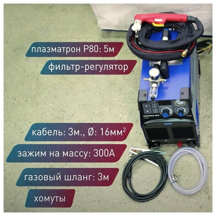 плазмарез, лазменный резак P80 6 метров - 1 шт, зажим на массу 300А - 1 шт, кабель 16mm2, 3 метра - 1 шт, воздушный фильтр-регулятор - 1 шт, шланг газовый 8х12, 3м – 1шт, паспорт, упаковка