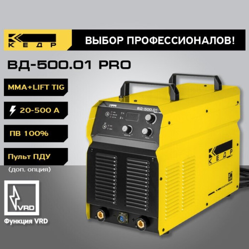 Аппарат инверторный кедр ВД-500.01 PRO предназначен для ручной дуговой сварки покрытым электродом. Данная модель сочетает в себе компактные размеры, высокую мощность и надежность. Достоинствами ВД-500.01 является наличие отключаемой функции VRD - понижение напряжения холостого хода, возможность регулировки сварочного тока с пульта дистанционного управления. В области атомного машиностроения аппарат используется для ремонтных работ реакторов и элементов турбин. Благодаря высокой мощности источника питания, возможно его применение для ручной и воздушно-дуговой строжки. Обратите внимание, что свидетельство НАКС не входит в комплект и является опцией для данного оборудования. Россия — родина бренда. Особенности: Повышенный КПД источника Широкий диапазон регулировок Увеличенное значение ПВ позволяет работать дольше без перерыва Минимальное разбрызгивание металла Класс защиты - IP21S Класс изоляции - H Сварка короткой дугой Блок VRD Наличие функций Hot Start, Arc Force, Anti Stick Возможность приобретения с сертификатом НАКС Комплектация: Сварочный инвертор — 1 шт. Вставка СКР — 2 шт. Ключ шестигранный — 1 шт. Сетевой кабель без вилки — 1 шт. Руководство по эксплуатации — 1 шт. Характеристики: Напряжение сети, В - 380 Габариты, мм 550х260х430 Вес нетто, кг 28.6 Режим работы, ПВ% 100 Диапазон сварочного тока, А 20-500 Диаметр электрода, мм 1.6-5.0 Максимальный сварочный ток, А 500 Мощность, кВт 23,5 Частота, Гц50/60 Толщина проваривания MMA, мм 1-60 Функция MMA - Arc Force "Форсаж дуги" Функция MMA - Hot Start "Горячий старт" Функция MMA - Ограничение холостого хода "VRD" Функция MMA - "Антизалипание" Режим "LIFT TIG" Подключение проводного пульта ДУ Дисплей