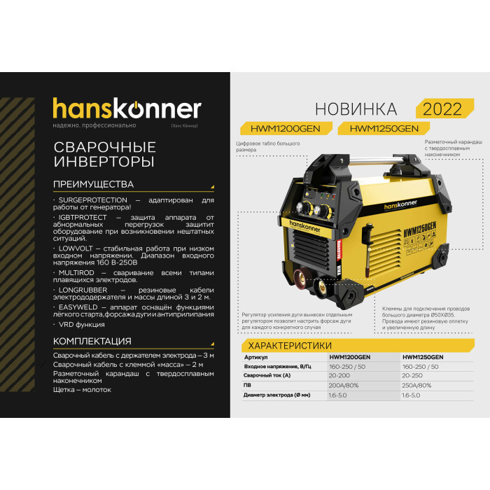 Ручная дуговая сварка (MMA), тип аппарата: инвертор, дополнительные функции: горячий старт, защита от перегрева, форсаж дуги, тип тока: постоянный, мощность: 6 кВт, диаметр электрода, max: 5 мм, диаметр проволоки, max: 4 мм, вес: 7.82 кг, Сварочный ток (MMA), max: 200 А, класс изоляции: H