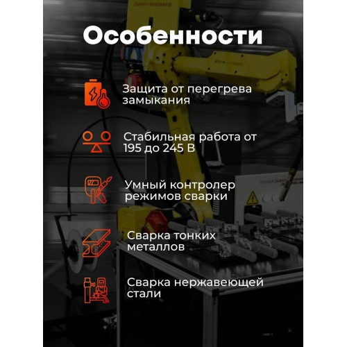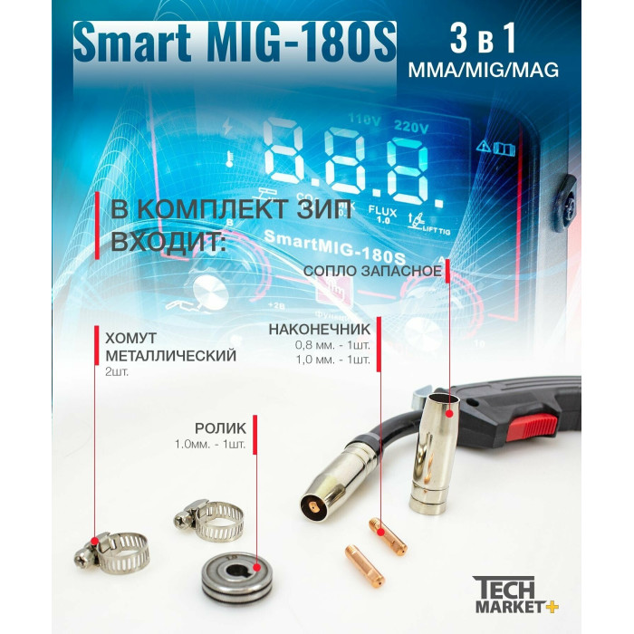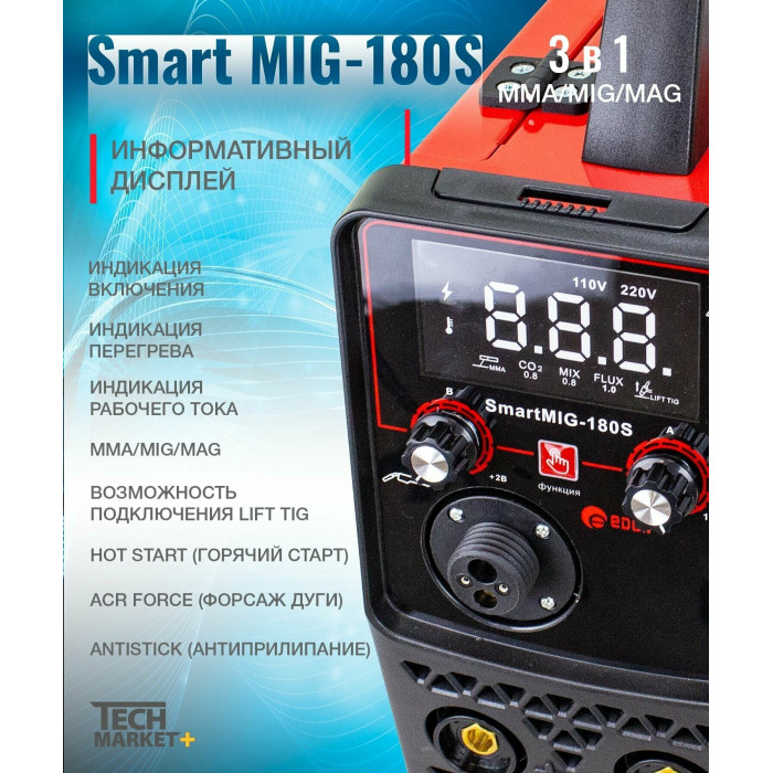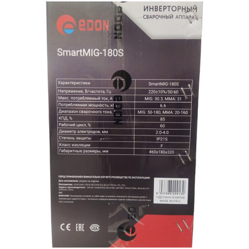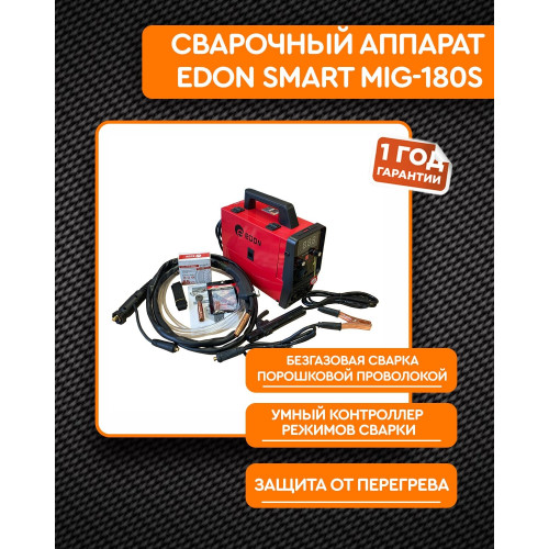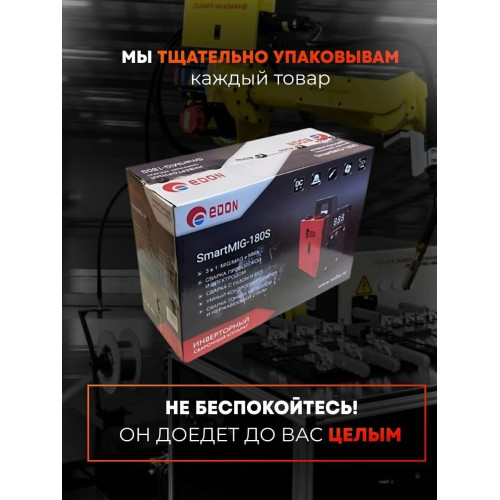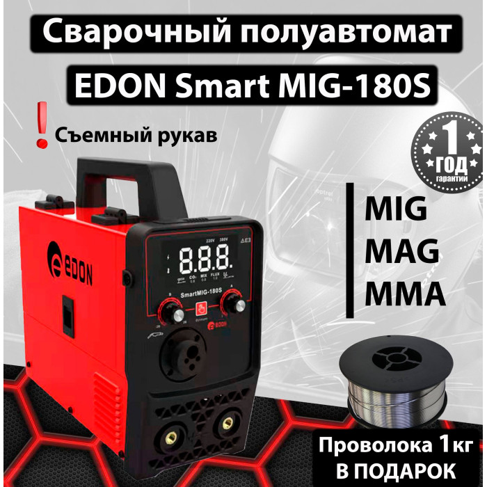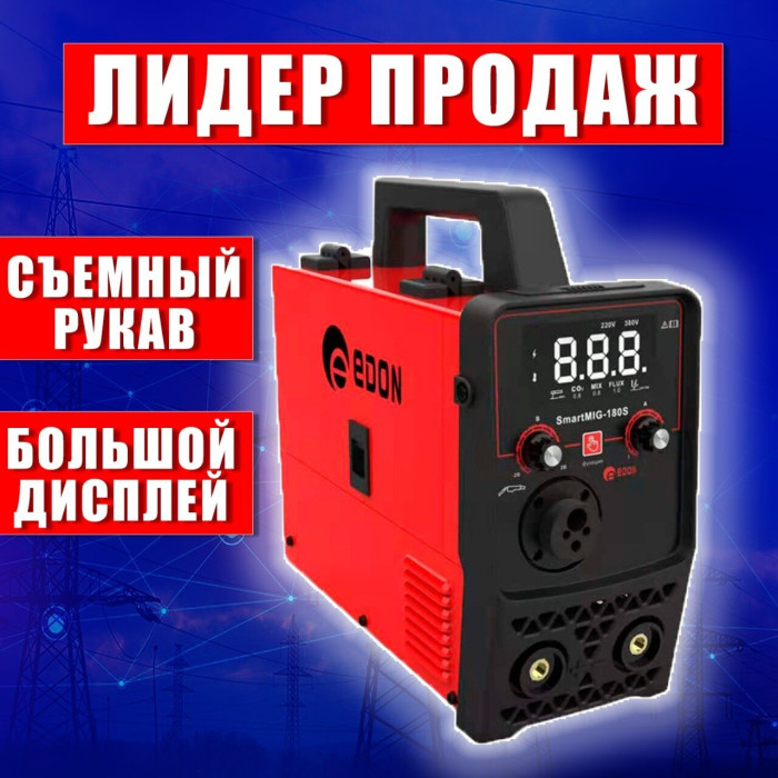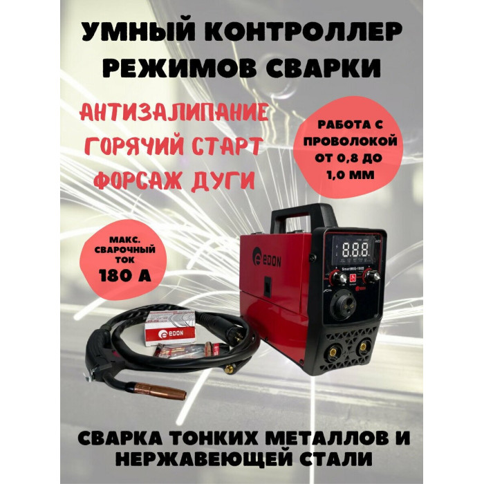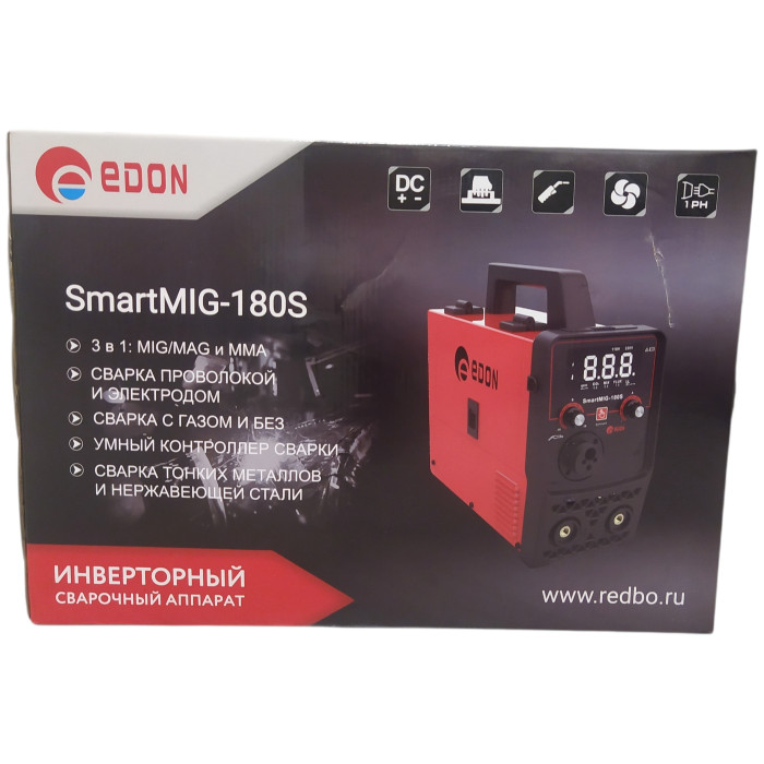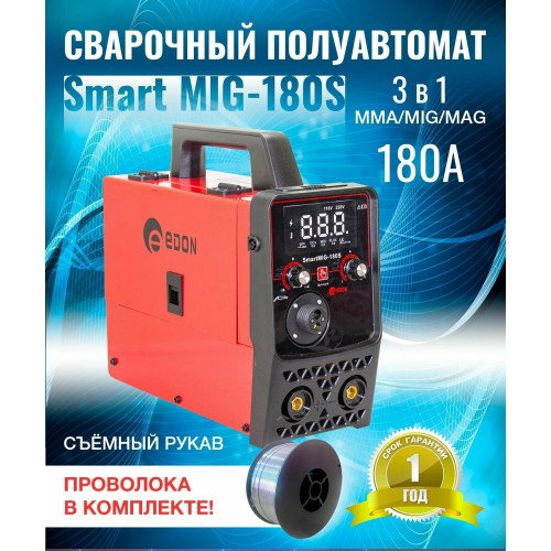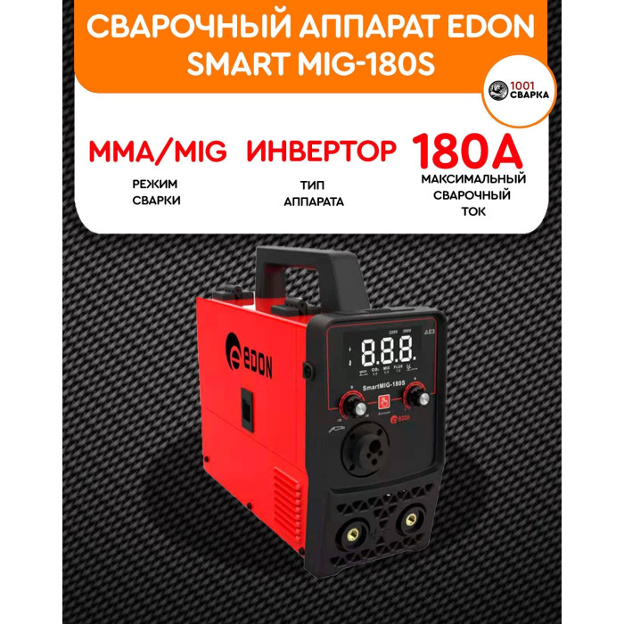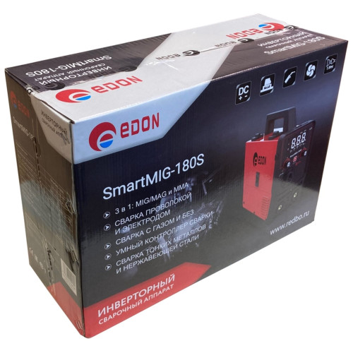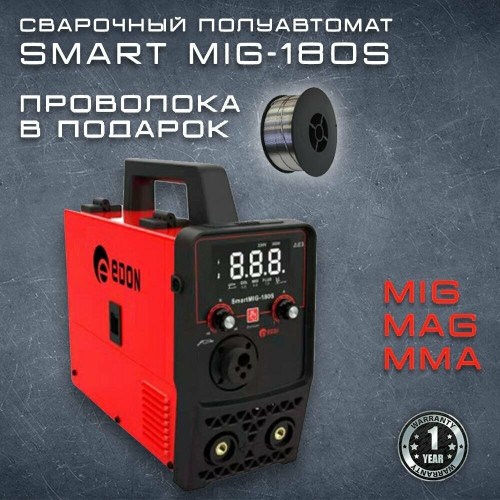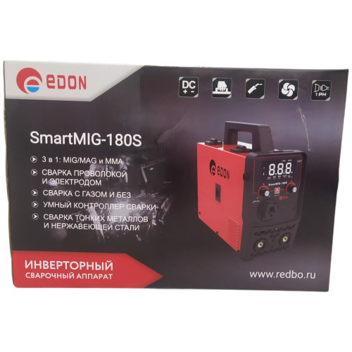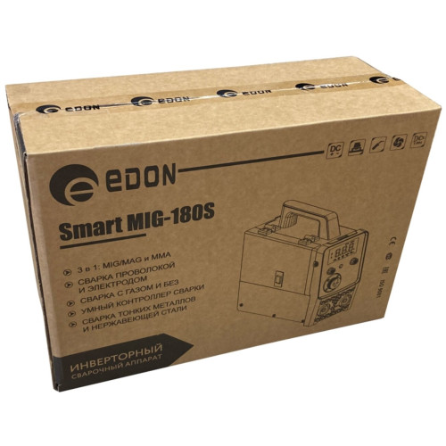 Современный цифровой сварочный аппарат полуавтоматической сварки, ручной дуговой сварки штучным электродом с покрытием Edon Smart MIG-180S бытового применения. Цифровой дисплей. Умный контроллер режимов сварки. Стабильная работа от 195 до 245 В. Работа с проволокой от 0,8 до 1,0 мм. Сварка тонких металлов и нержавеющей стали. Защита от перегрева и короткого замыкания. Многослойное лаковое покрытие электронных компонентов. Контроллер защищен от ЭМИ. Механизм подачи проволоки защищен от пыли. Сварка в среде защитных газов и безгазовая сварка порошковой проволокой.