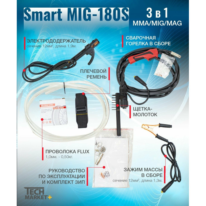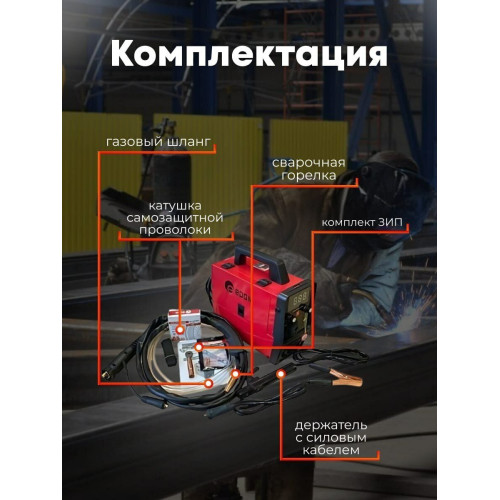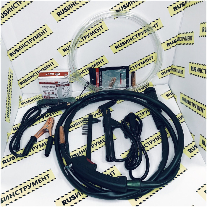 сварочный аппарат; сварочная горелка в сборе, длина 3,0 м.; электродный держатель с силовым кабелем, сечение 12 мм2, длина 2 м.; кабель-масса с зажимом, сечение 12 мм2, длина 1,3 м.; газовый шланг; комплект ЗИП; плечевой ремень; катушка самозащитной проволоки AWS E71T-GS д.1 мм, вес 0,5 кг.; инструкция-паспорт; упаковка.