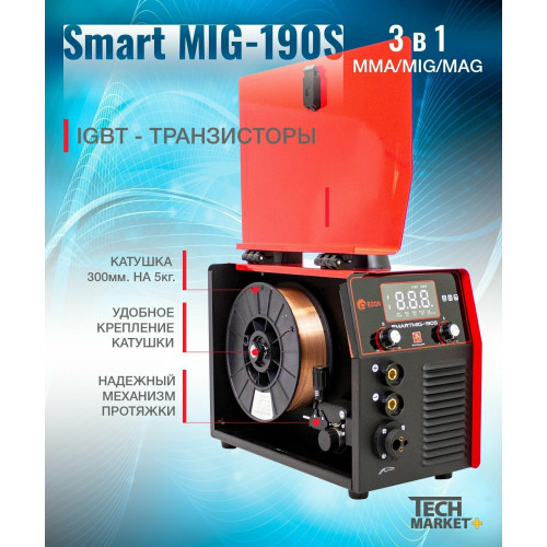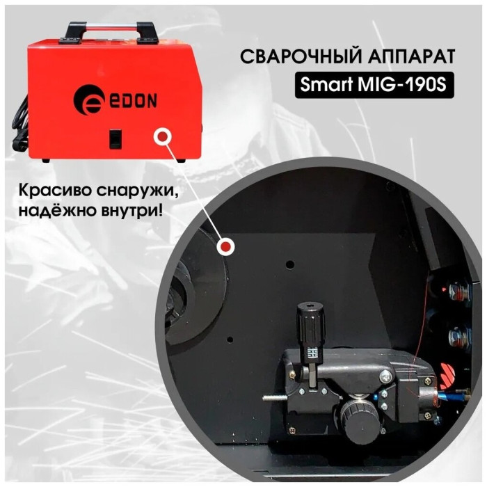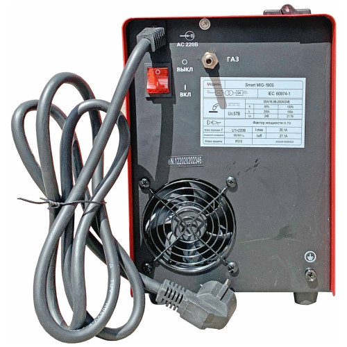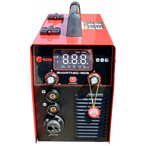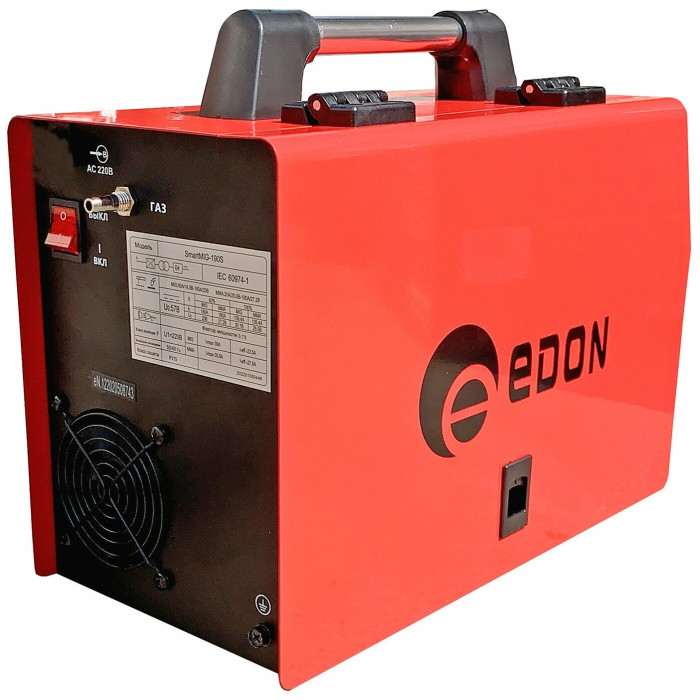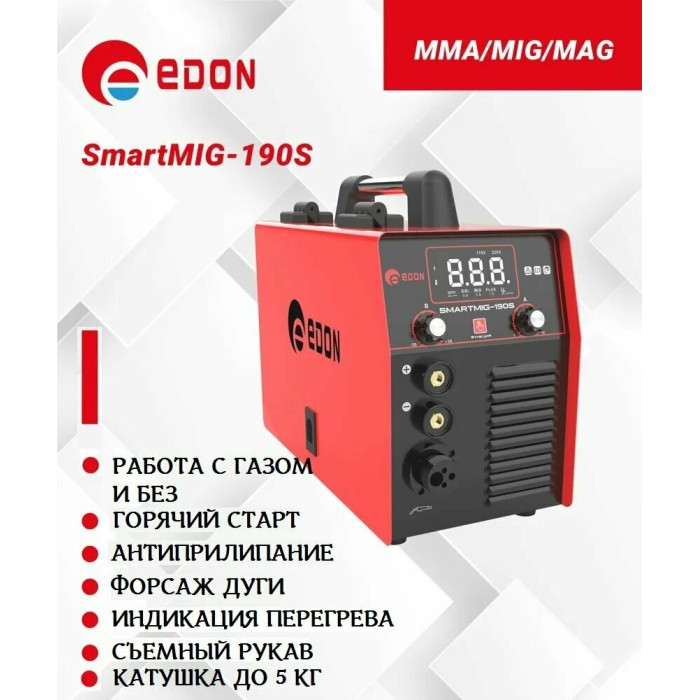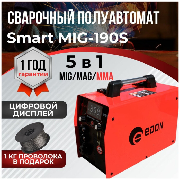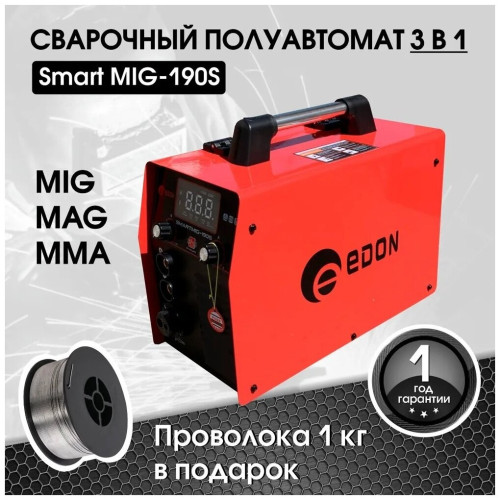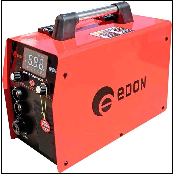 Сварочный инверторный полуавтомат с функцией ручной дуговой сварки Edon Smart MIG-190S - предназначен для ручной дуговой сварки ММА стальных металлоконструкций из низкоуглеродистых и низколегированных сталей штучными электродами с покрытием всех видов и размеров от 2.0 до 4.0мм, а также для сварки MIG/MAG/NoGas изделий из нержавеющей стали плавящимся электродом(проволокой) размером 0.8-1.0 в защитной газовой среде или без газа порошковой проволокой(с флюсом). Напряжение/частота, В/Гц -220+-10%/50. Макс. потребляемый ток, А MIG-30; MMA-35,8. Диапазон сварочного тока, А MIG: 50-180; MMA: 20-180. Макс. потребляемая мощность, кВт 6.6. Макс. сварочный ток, А 180. Рабочий цикл, %*60. КПД, %85. Диаметр электродов, мм 2.0-4.0. Диаметр сварочной проволоки. мм 0.8-1.0. Степень защиты IP21S. Класс изоляции F. Вес, кг 12.3. Габаритные размеры, мм 490х325х390 акция!