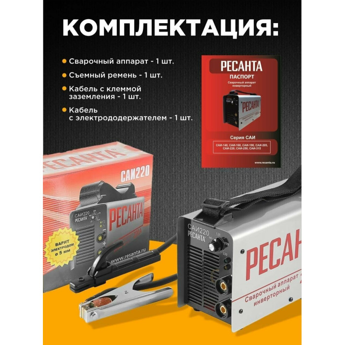 Описание: Инверторный сварочный аппарат Ресанта САИ-220 подходит для сварки металлических конструкций постоянным током покрытым электродом до 5 мм. Сварочный ток регулируется от 10 до 220 А ровных сварных швов и для более точной работы.