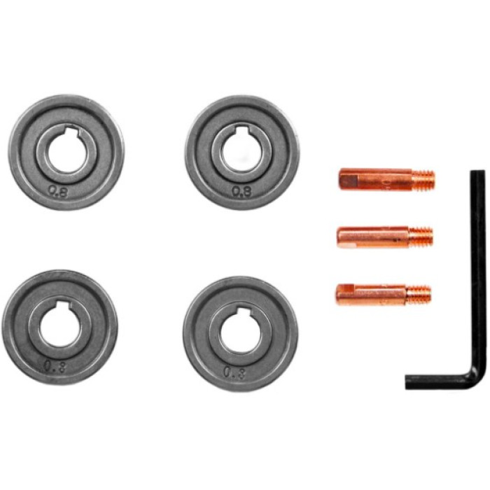 сварочный аппарат, сварочная горелка MIG/MAG, сварочный кабель с электрододержателем, сварочный кабель с зажимом на массу, щиток сварочный, щетка-молоток, ролик (0.6/0.8, 0.8/1.0) (2 шт.), контактные наконечники (0.6/0.8/1.0) (3 шт.), ключ, руководство по эксплуатации