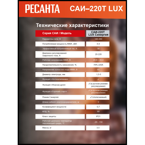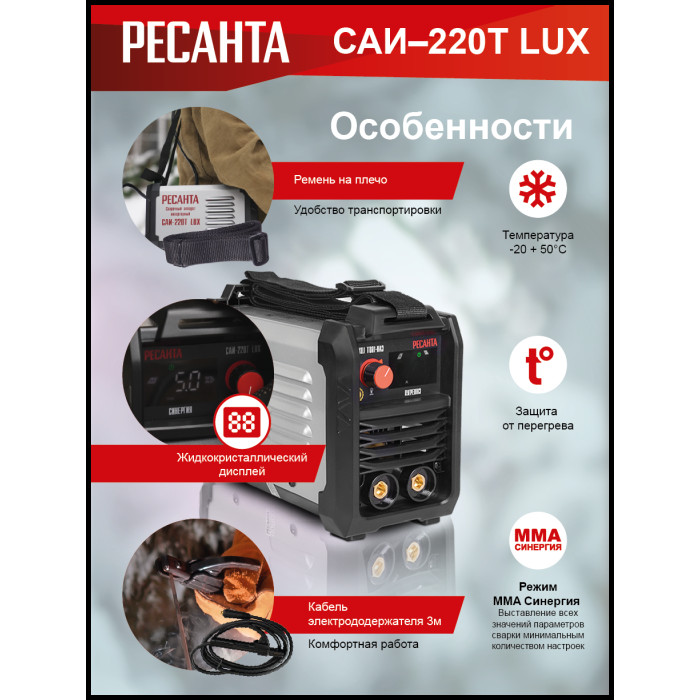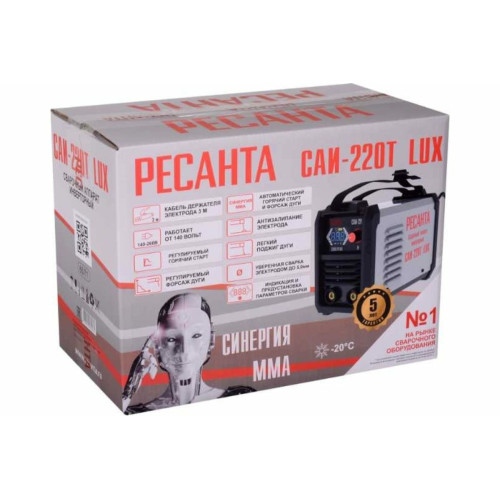 Сварочный инвертор Ресанта САИ-220Т LUX предназначен для ручной дуговой сварки штучным покрытым электродом на постоянном токе и электродом с рутиловым и основным покрытием (режим ММА). Сварочные аппараты разработаны на базе IGBT транзисторов .