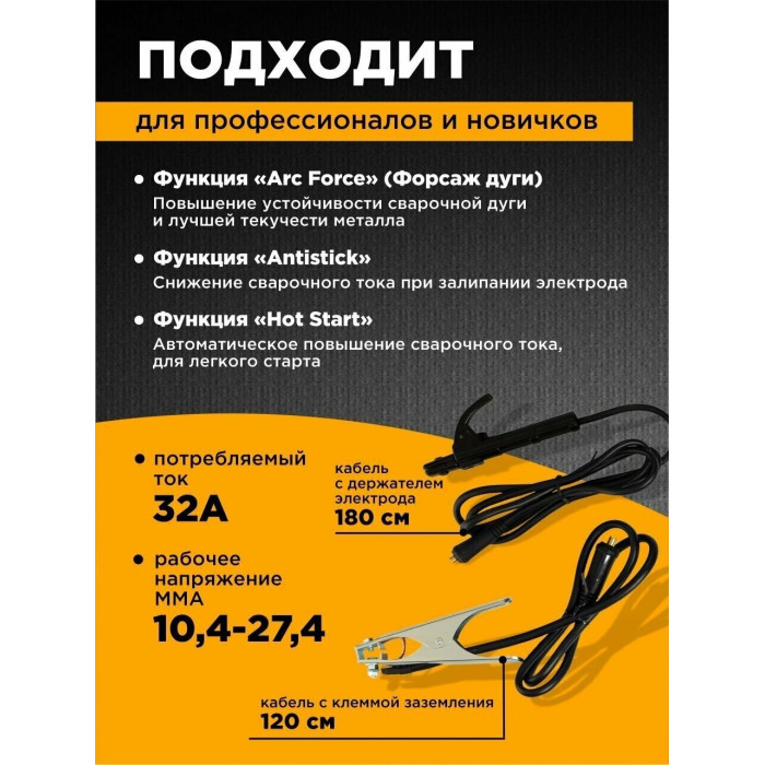 сварочный аппарат, кабель с электрододержателем, кабель с клеммой заземления, паспорт