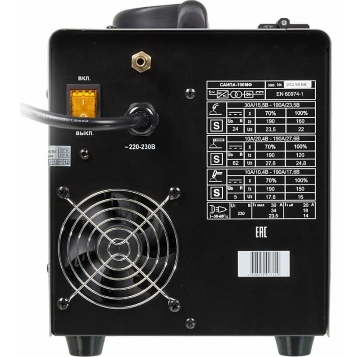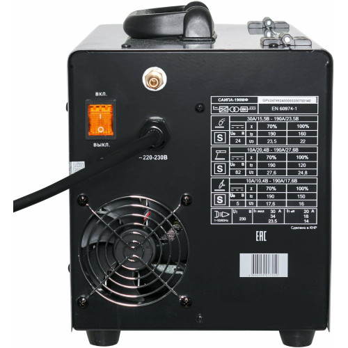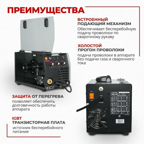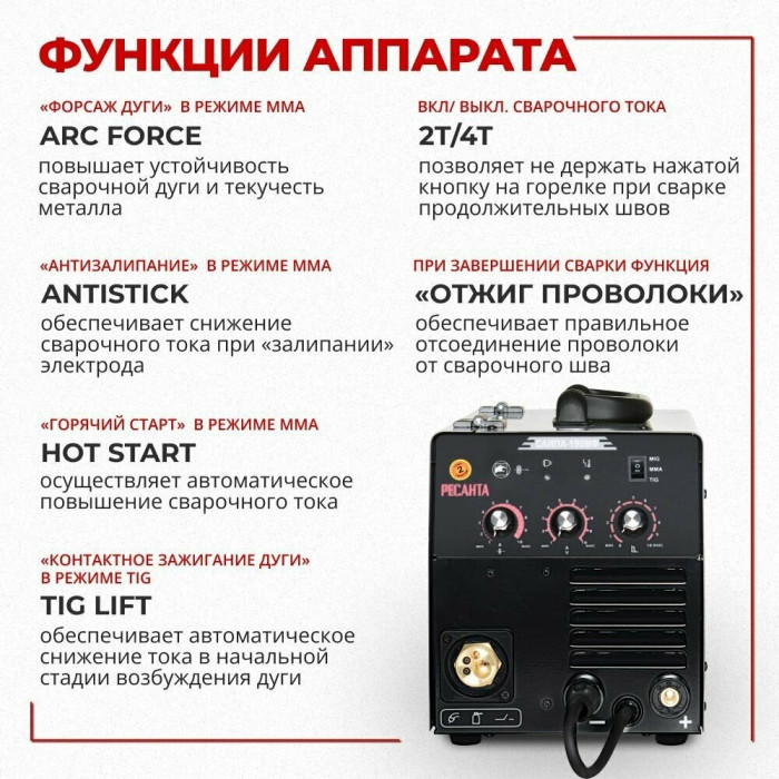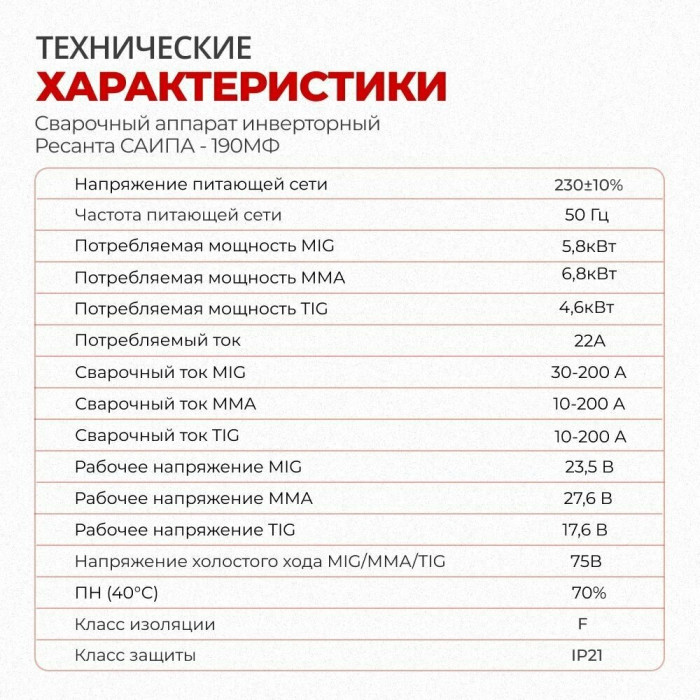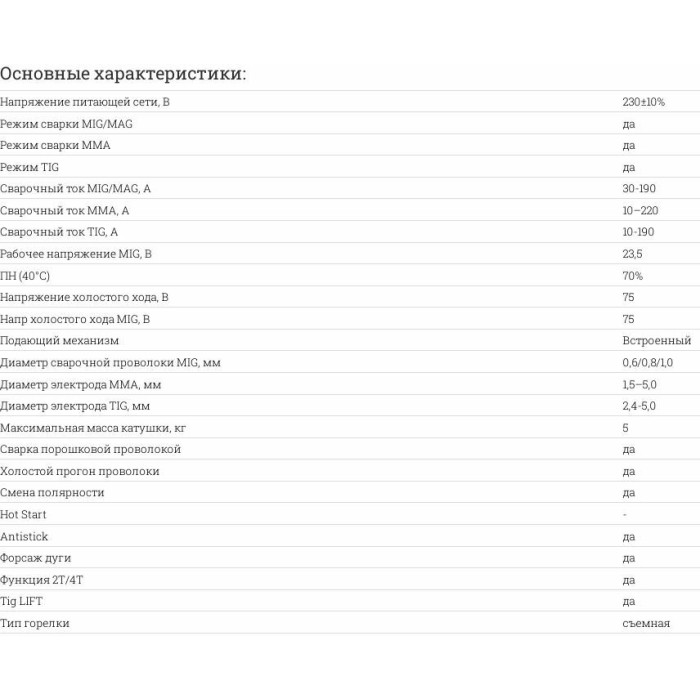 Полуавтоматическая сварка (MIG/MAG), Ручная дуговая сварка (MMA), Аргонодуговая сварка (TIG), тип аппарата: инвертор, дополнительные функции: антиприлипание, горячий старт, форсаж дуги, Сварка порошковой проволокой, Смена полярности, тип тока: постоянный, мощность: 6.80 кВт, диаметр электрода, max: 5 мм, диаметр проволоки, max: 1 мм, вес: 13 кг, толщина металла, max: 80 мм, Сварочный ток (MMA), max: 200 А, класс изоляции: F